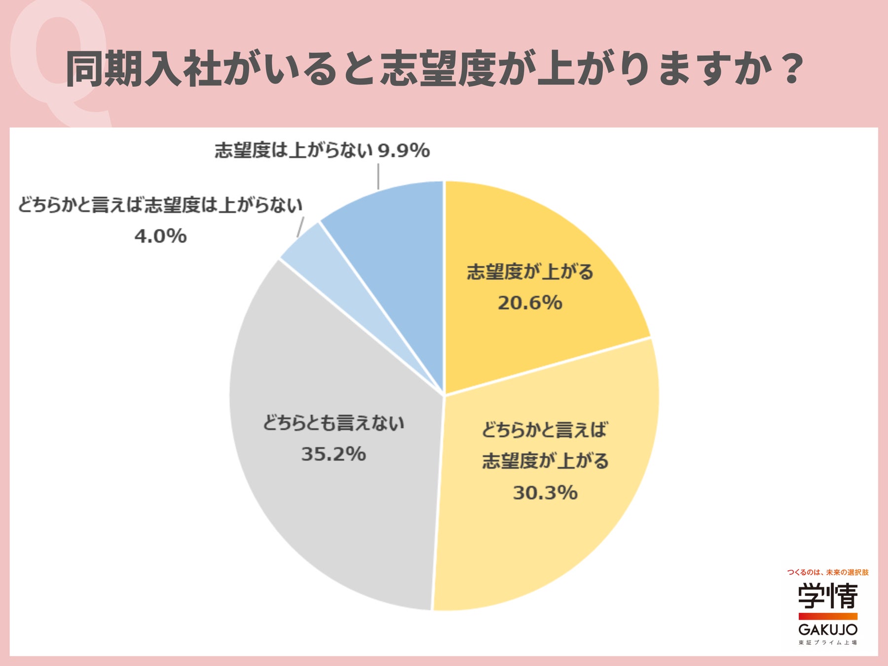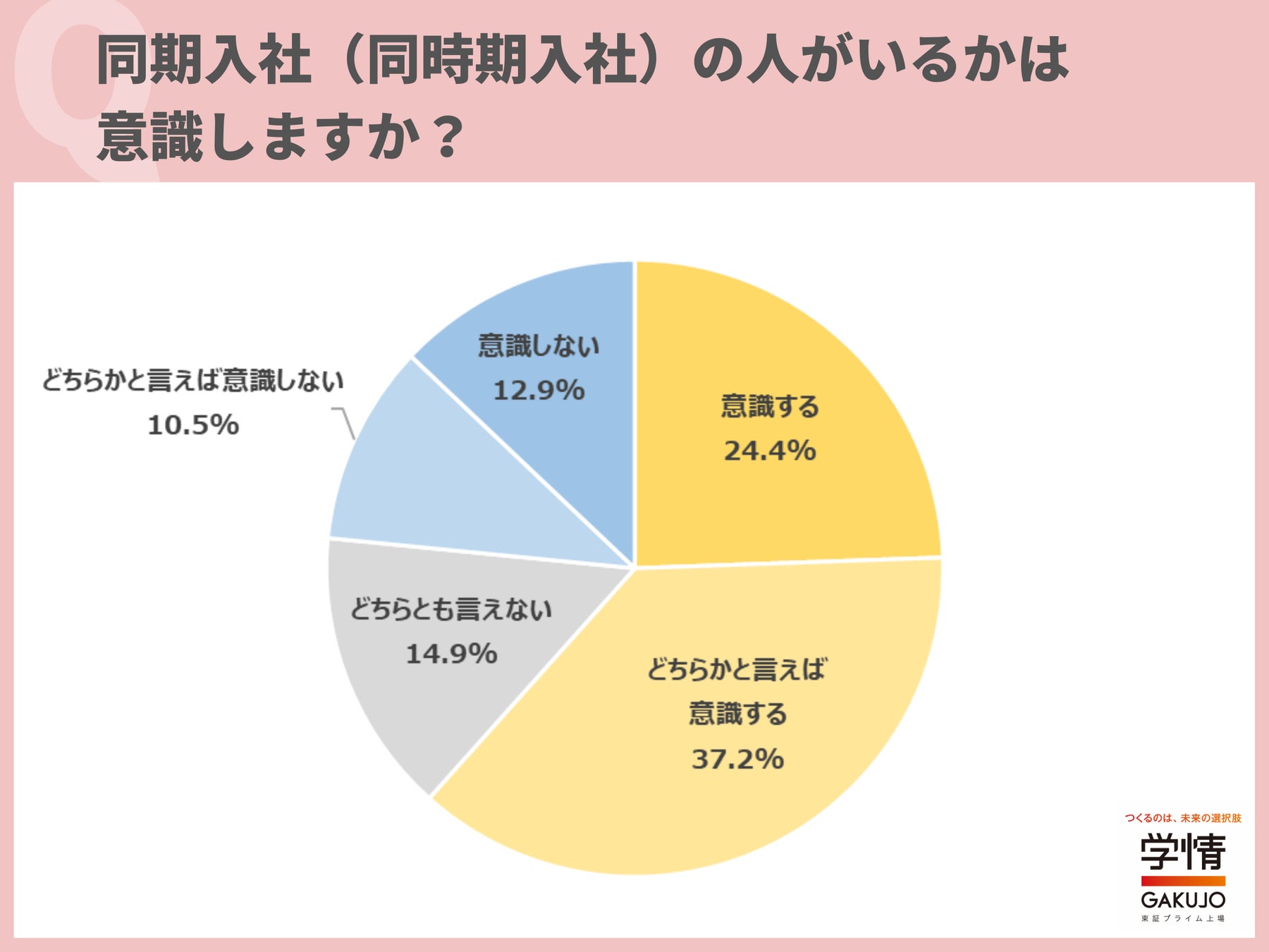 株式会社学情(本社:東京都中央区)は、20代の仕事観や働く意識をひも解くために、アンケート調査を実施しました。今回は、「同期入社」に関して調査。同期入社(同時期入社)がいるかを「意識する」と回答した20代が6割を超えました。また半数以上が、同期入社がいると「志望度が上がる」と回答。「同期がいるほうが心強い」「同期がいると、悩みや不安を共有しやすい」「同期がいるほうが切磋琢磨し、高め合うことができそう」「同期をライバルのように捉えることで、仕事へのモチベーションが高まると思う」といった声が上がりました。同期入社がいると嬉しい点は、「同期で助け合うことができる」が最多。次いで、「同期で交流ができる」、「会社の雰囲気になじみやすい」が続きました。