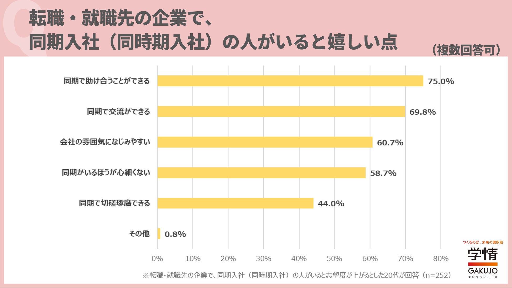 同期入社がいると嬉しい点は、「同期で助け合うことができる」75.0%が最多。次いで、「同期で交流ができる」69.8%、「会社の雰囲気になじみやすい」60.7%が続きました。