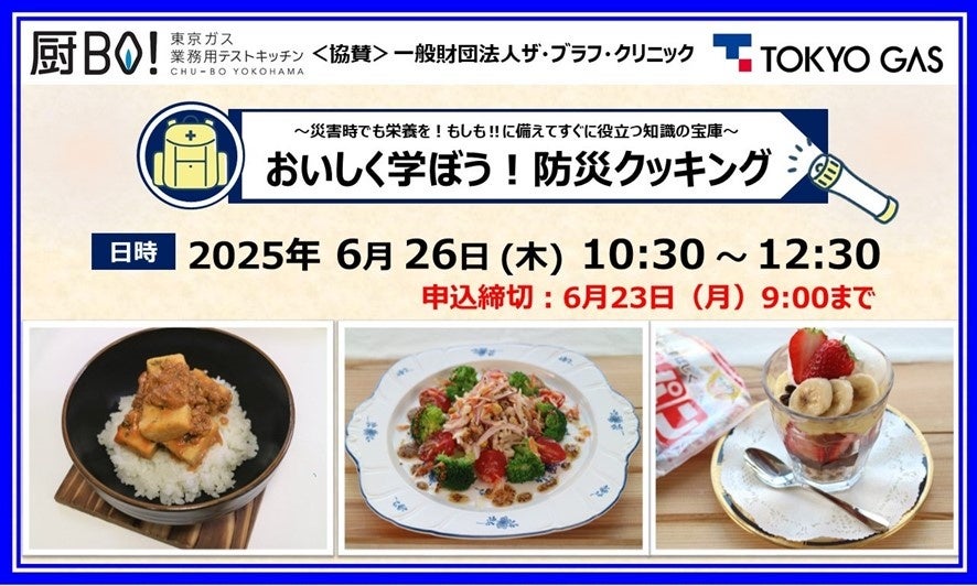 東京ガス業務用テストキッチン 厨BO!YOKOHAMAは、「~災害時でも栄養を!もしも‼に備えてすぐに役立つ知識の宝庫~おいしく学ぼう!防災クッキング」を開催いたします。