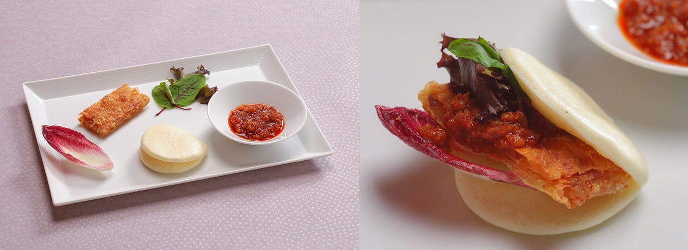 主役となる湯葉のはさみ揚げは、ザーサイ、アーモンド、揚げ玉ねぎ、シイタケ、ネギなどを湯葉で四層に重ね、揚げてあります。大豆を使ったスパイシーでピリ辛な魚香(ユイシャン)ソースと湯葉の食感をお楽しみください。