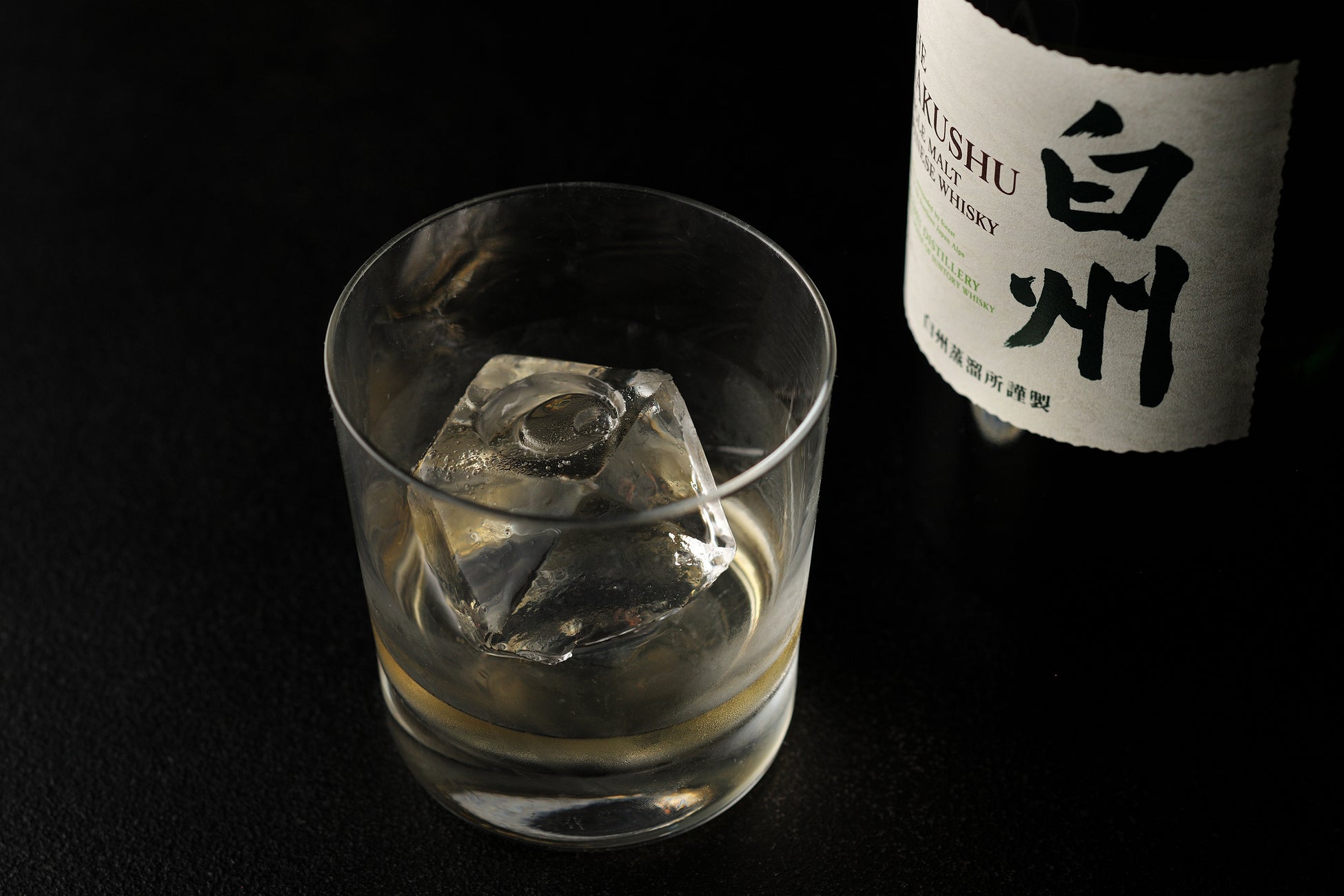 焼き氷とともに味わうのは白州ウイスキーです。かき氷でも使用している純度の高い氷を入れて、ロックスタイルで味わいます。氷が解けるにつれて感じるまろやかな味わいや複雑な香りの変化を楽しめるのが特徴です。さらに、かき氷と合わせることで、フランベされたメレンゲの香ばしさと、白州ウイスキーならではの繊細な甘みが加わり、深みのあるの味わいを堪能します。