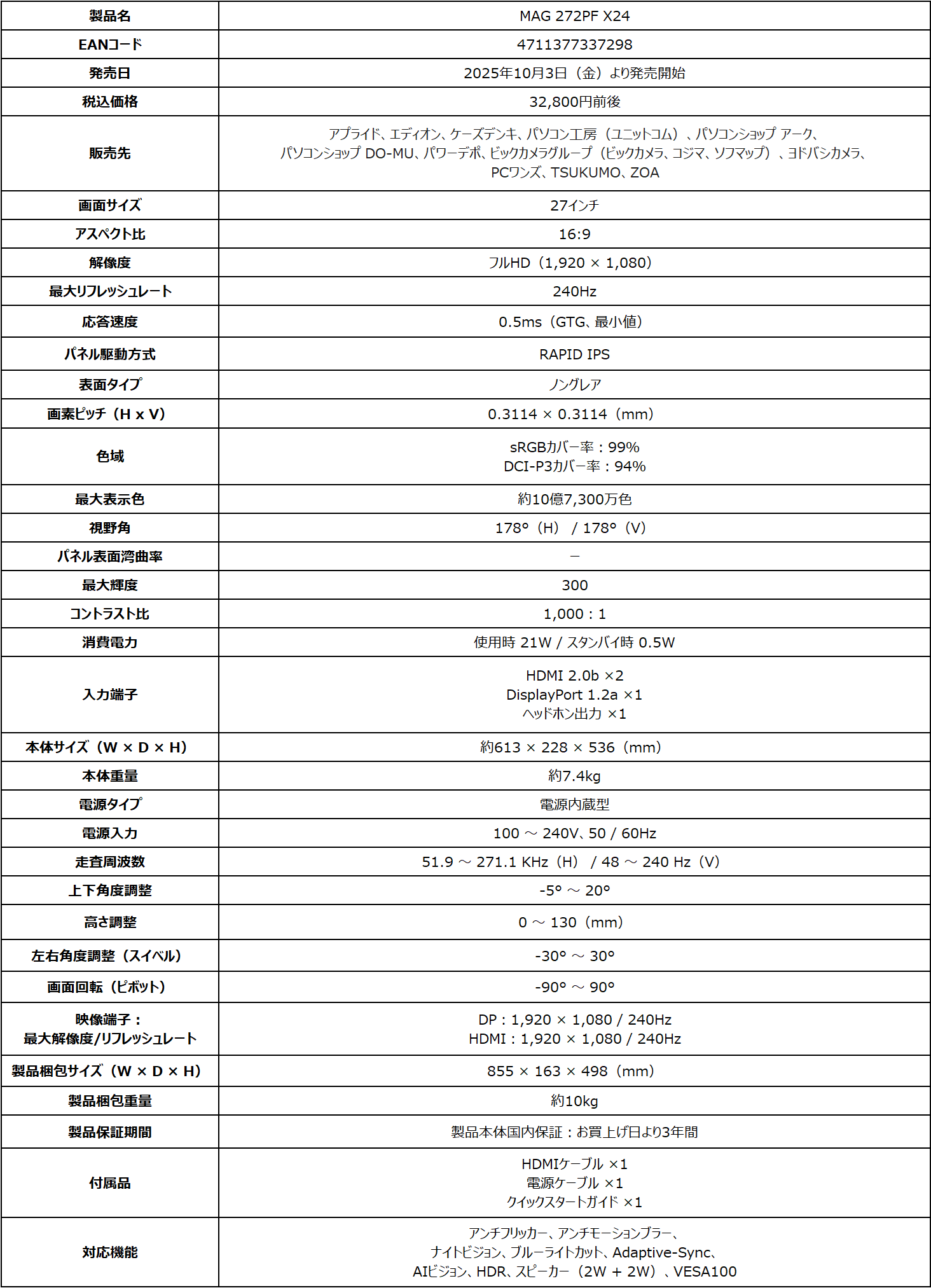 240Hz・0.5ms対応のRAPID IPSパネルに高性能スタンド搭載 スピーカー搭載でゲームとの高い親和性も確保したゲーミングモニター 「MAG 272PF X24」発売