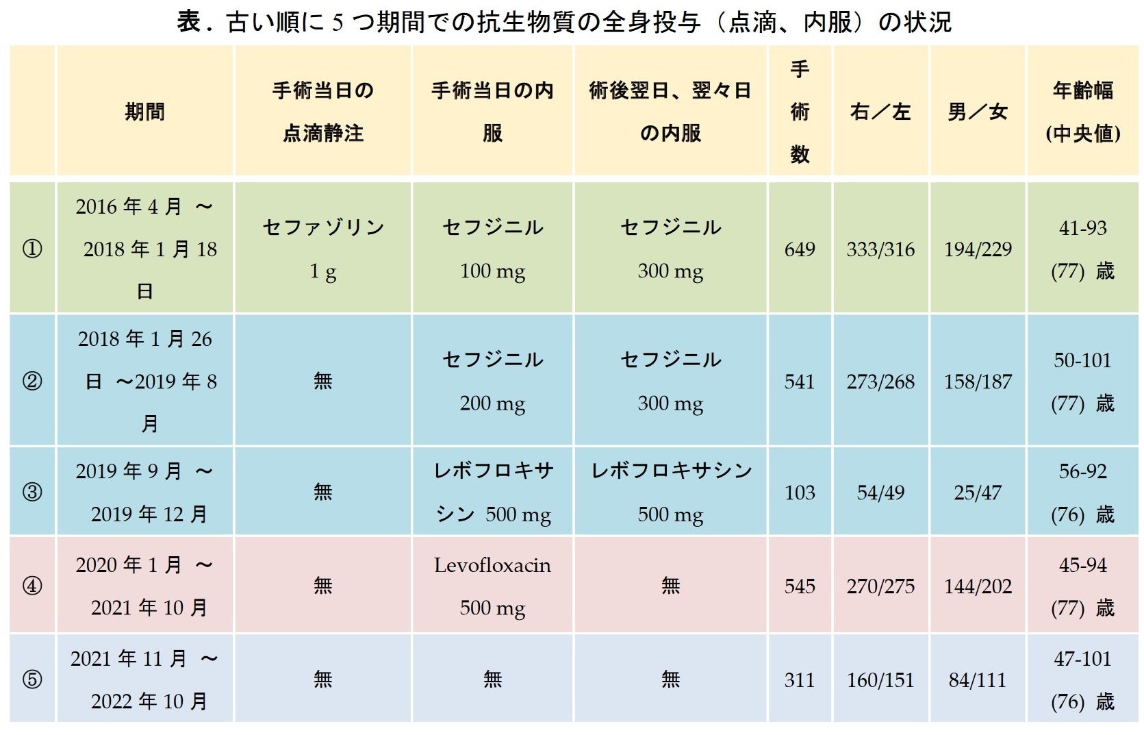 今回の調査研究において、上記5つの時期すべてで術後感染は認められませんでした。今回の調査から白内障手術では、感染予防のために抗生物質の全身投与を行う必要はないと言えます。