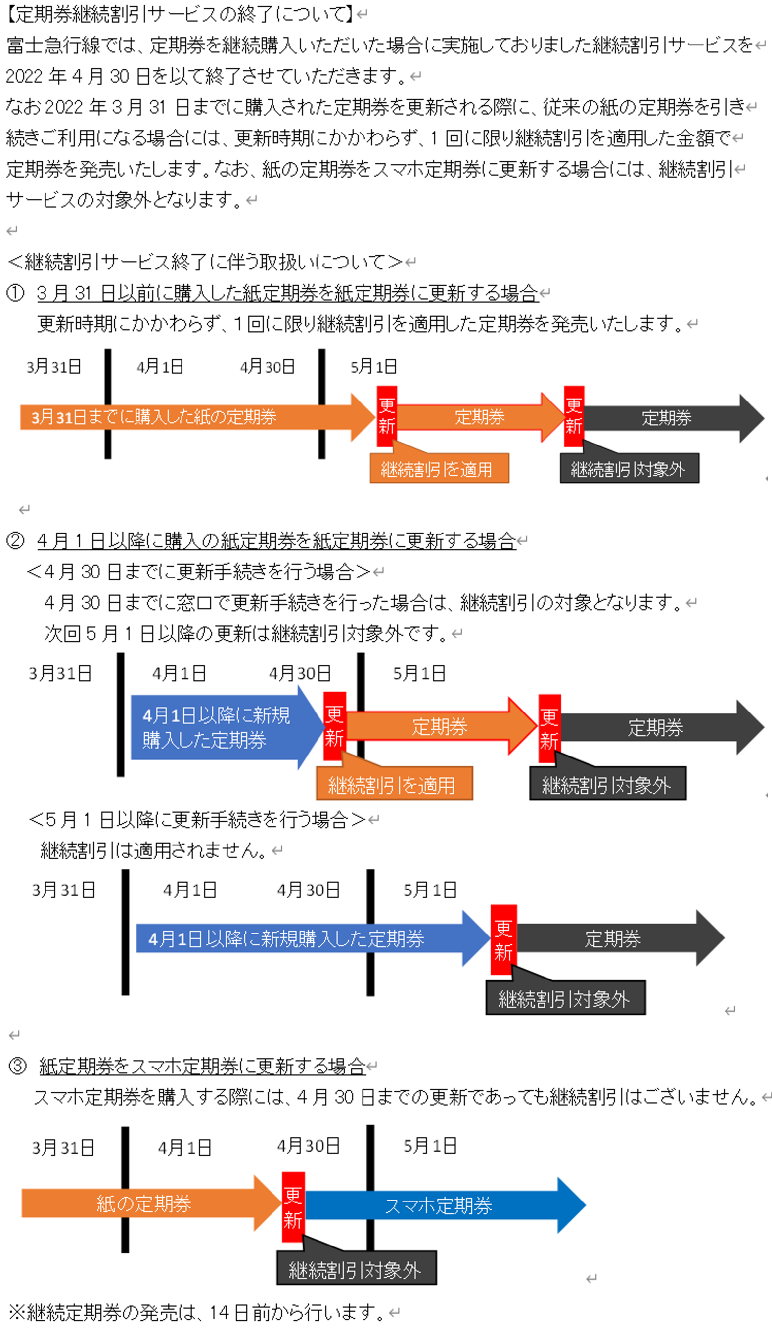富士急行線では、定期券を継続購入いただいた場合に実施しておりました継続割引サービスを2022年4月30日を以て終了させていただきます。なお2022年3月31日までに購入された定期券を更新される際に、従来の紙の定期券を引き続きご利用になる場合には、更新時期にかかわらず、1回に限り継続割引を適用した金額で定期券を発売いたします。なお、紙の定期券をスマホ定期券に更新する場合には、継続割引サービスの対象外となります。
