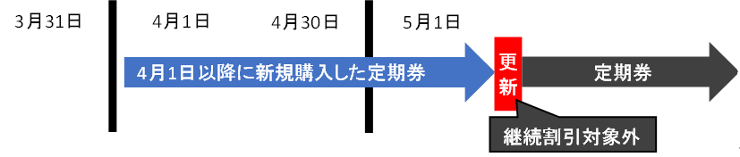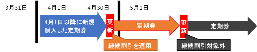 更新時期にかかわらず、1回に限り継続割引を適用した定期券を発売いたします。