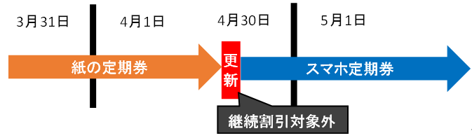 スマホ定期券を購入する際には、4月30日までの更新であっても継続割引はございません。