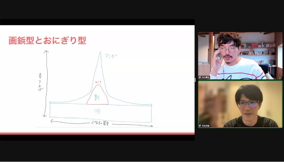 電子書籍の台頭により旧作が売れようになったことで出版社は好景気ですが、新作を作る立場から見るとこの画鋲型の裾野のところで戦って尖っているところを目指す戦いになるので厳しさを感じます。一方Webtoonは旧作と呼べるものはまだ少なく、基本は新作しかないですよね。赤いところが指すように、おにぎり型というか、出せばまあまあ売れる対照的な形になっています。
