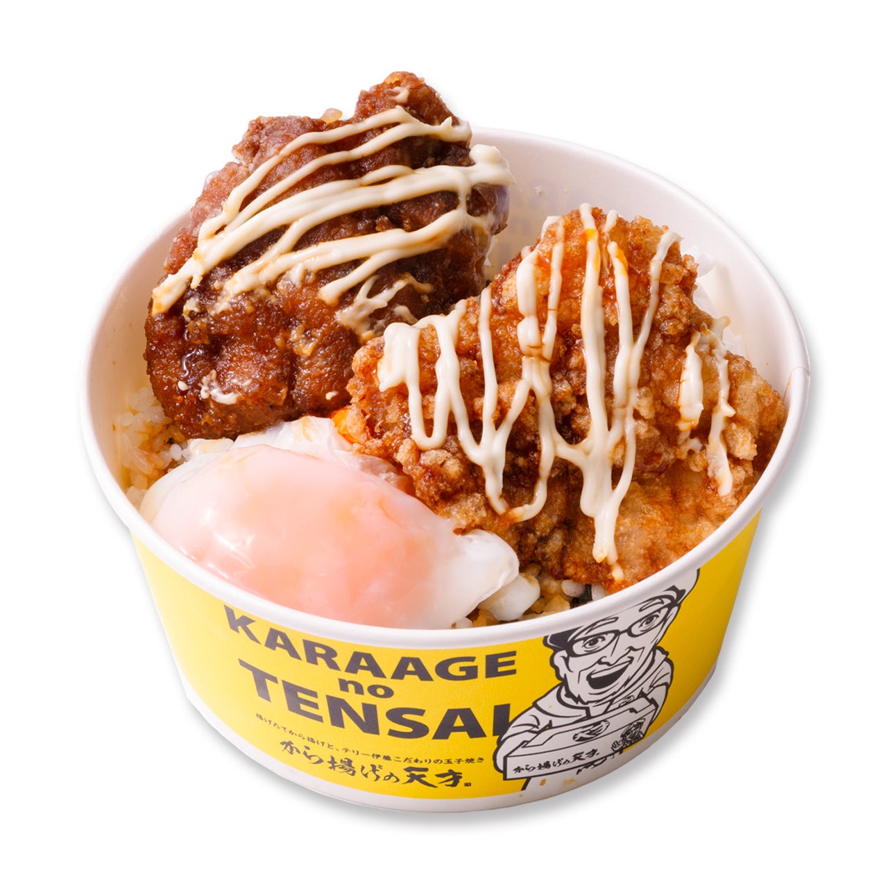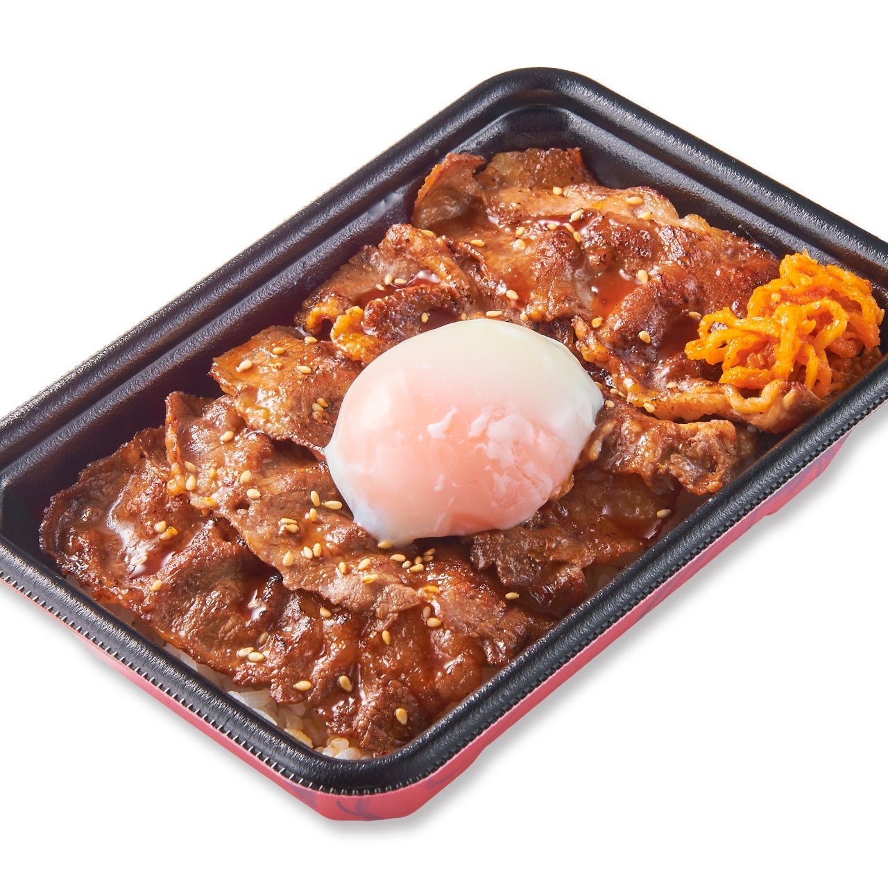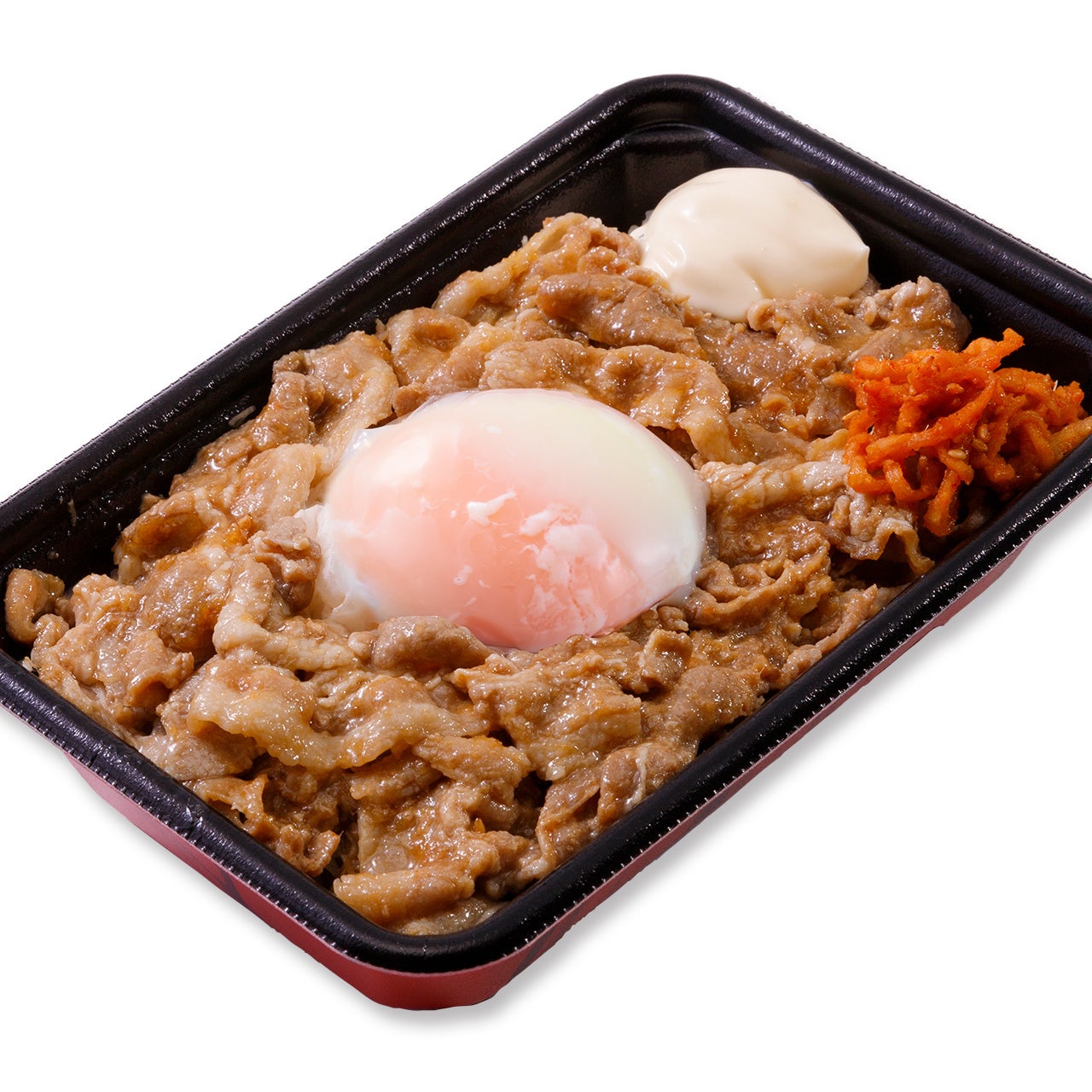 「焼肉弁当」の甘辛ダレやパンチの効いた「しょうが焼き弁当」にとろ~り温玉をからめれば美味しいこと間違いなし!創業当初から人気の「から揚げ丼」もテリマヨと温玉の相性抜群です。