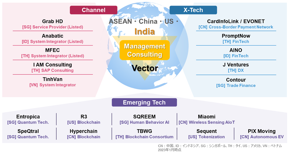 TISは2026年にグローバル連結売上高1,000億円を目指し、チャネル(Channel)、クロステクノロジー(X-Tech)、エマージングテクノロジー(Emerging Tech)という3つのテーマを掲げ、ASEAN地域・中国・米国の有力企業とのパートナーシップを進めてきました。グローバル事業のさらなる強化に向け、中国・ASEAN地域に次ぐアジアにおける第3の有力市場であるインドでのチャネルの拡大、および既存3テーマに次ぐ新たなるテーマとしてコンサルティング事業へのバリューチェーン拡大を実現するため、Vector社との資本・業務提携を実施しました。