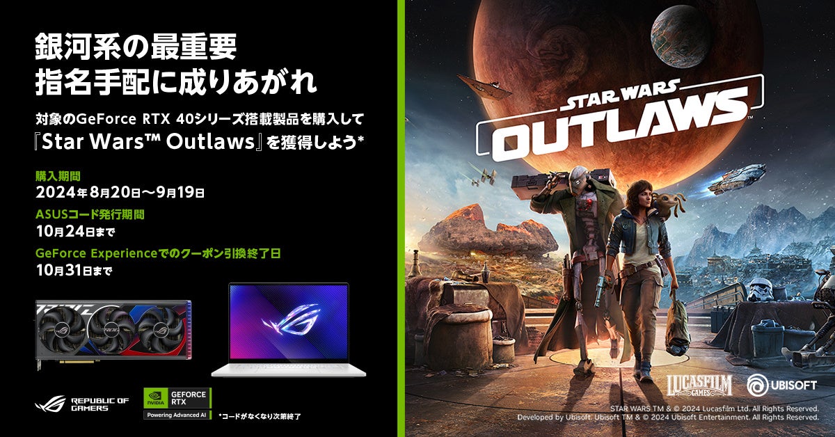 ASUS JAPAN株式会社は、GeForce RTX 40シリーズ搭載のキャンペーン対象製品を購入して、「Star Wars Outlaws」が獲得できる「Star Wars Outlawsバンドルキャンペーン」の開催を発表しました。