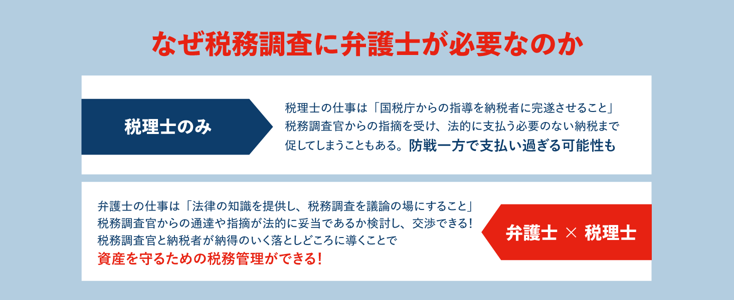 納税者にとって理想的な形は、税の申告業務には税理士が、税務署との交渉には弁護士が当たることです。