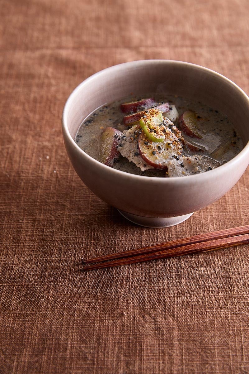黒ゴマ豚汁サツマイモ入り/コマツナとひじきのホットサラダ/ルッコラと柿のサラダ/サトイモのチーズガレット/キノコの炊き込みご飯 など