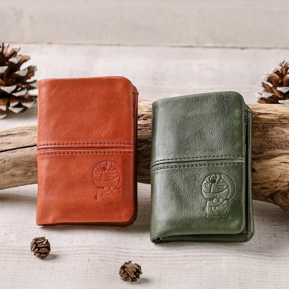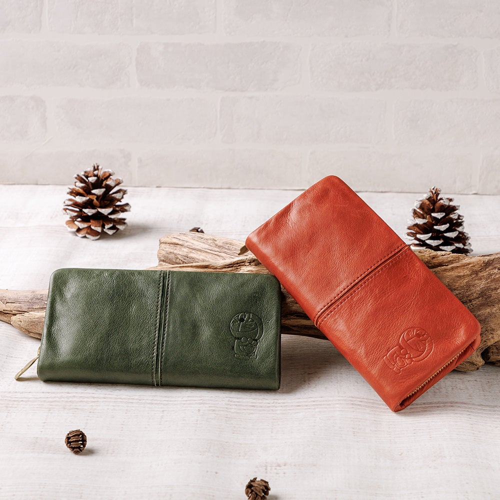 天然の牛革に素押しでドラえもんのイラストがデザインされた、ドラえもん未来デパート限定の「ロングウォレット」、二つ折りの「ショートウォレット」、「ペンケース」です。革製ならではの触り心地や経年変化を楽しむことができ、それぞれ引手や付属のチャームがドラえもんの後ろ姿のデザインになっています。