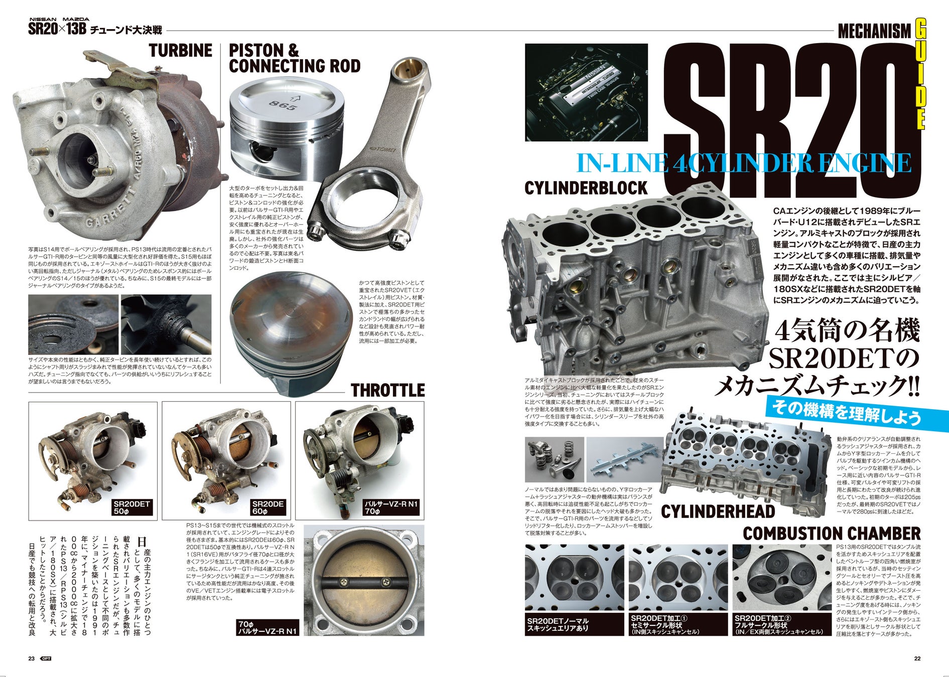 特集の始まりは主役とも言えるエンジンのメカニズムガイド。SR20と13Bのそれぞれで、その構造や機構、バリエーションについて解説している。さらに、搭載車種のカタログも見応えバッチリだ。