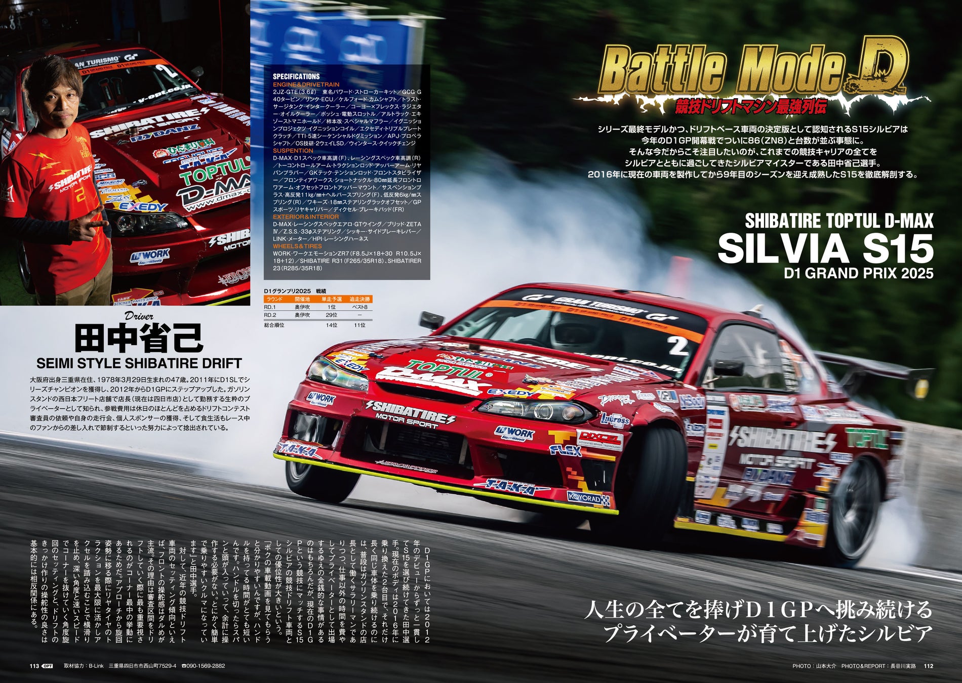 競技ドリフトのトップランカーとその愛機のスペックを紹介する大好評連載『バトルモードD』。今月はシルビアマイスターとして知られる、田中省己選手のS15をフィーチャーしている。