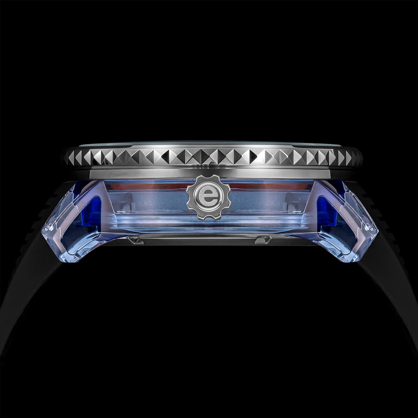 クリアブルーのケースにオレンジの文字盤、ブラックのストラップを合わせたモデルと、クリアレッドのケースにブルーの文字盤とストラップを合わせた2モデルが登場。ファッションにも合わせやすい、スポーティなカラーコンビネーションをお楽みいただけます。