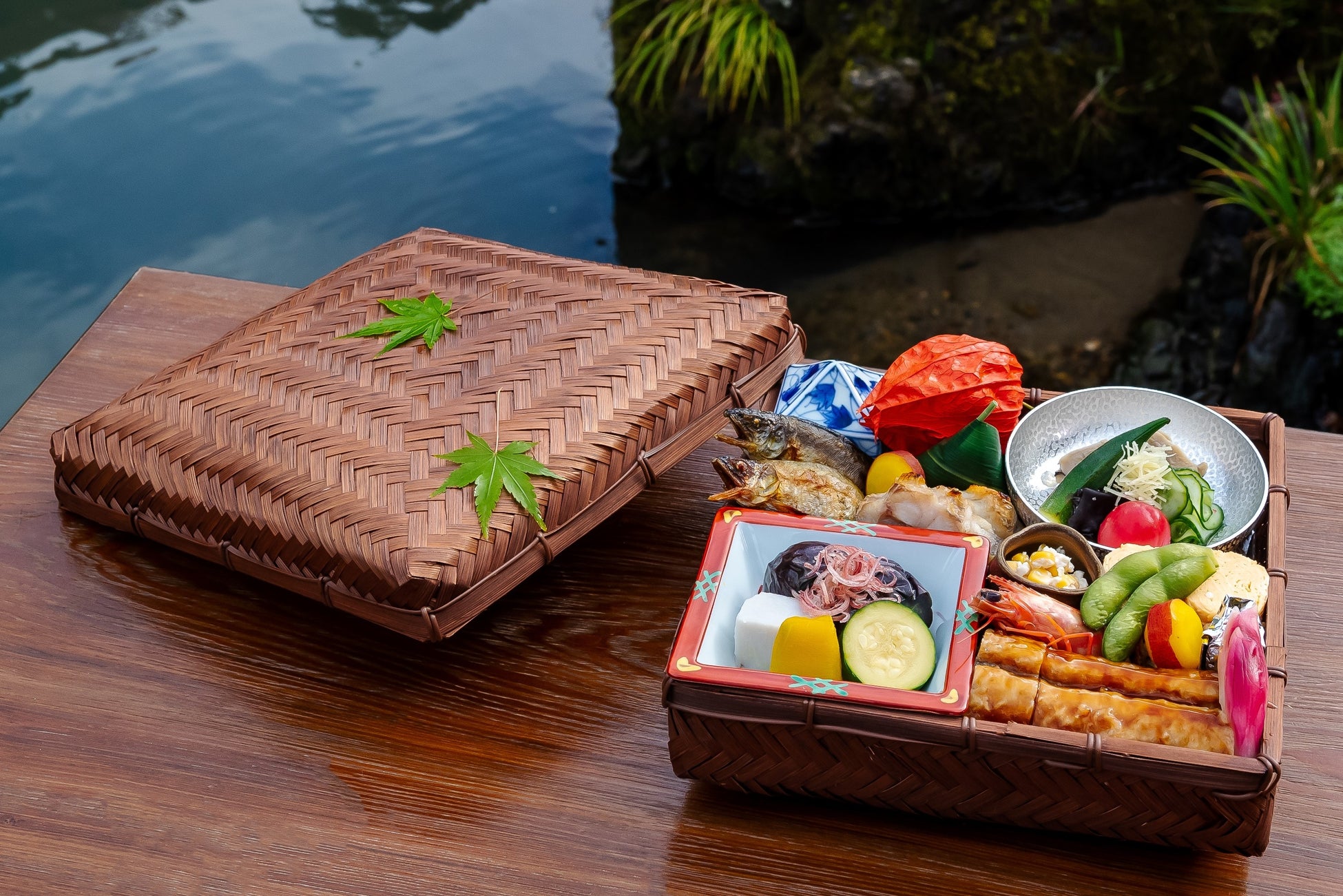 客室から涼しげな翡翠色の大堰川と朝日に照らされた青もみじを眺めながら、さっぱりと味わえる「納涼朝食」を味わいます。献立は、鰻に茗荷や大葉などの薬味を入れた冷や汁に加え、総料理長が厳選した旬魚の西京焼き、生湯葉と温泉玉子の餡掛けなど、食欲が落ちる夏にも食べやすい内容に仕立てました。