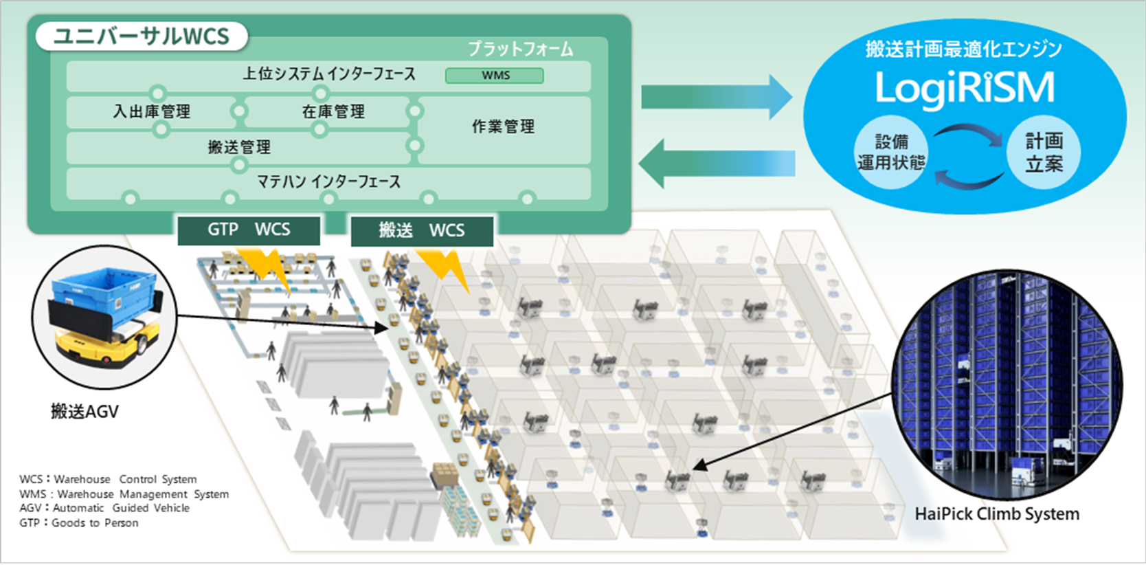 本システムが、日立独自の搬送計画最適化エンジン「LogiRiSM(ロジリズム)」と連携し、オーダー投入順序や搬送ルートをリアルタイムに最適化。その計画に基づき、国内初本格導入(*4)となるHAI ROBOTICS社ロボットによる自動ピッキング機能と高密度保管を両立したGTP(*5)システムである「HaiPick Climb System」、搬送AGV(*6)やコンベヤなど複数設備を一元的に制御することで、高密度な保管体制と圧倒的な出荷スピードの両立を実現しています。