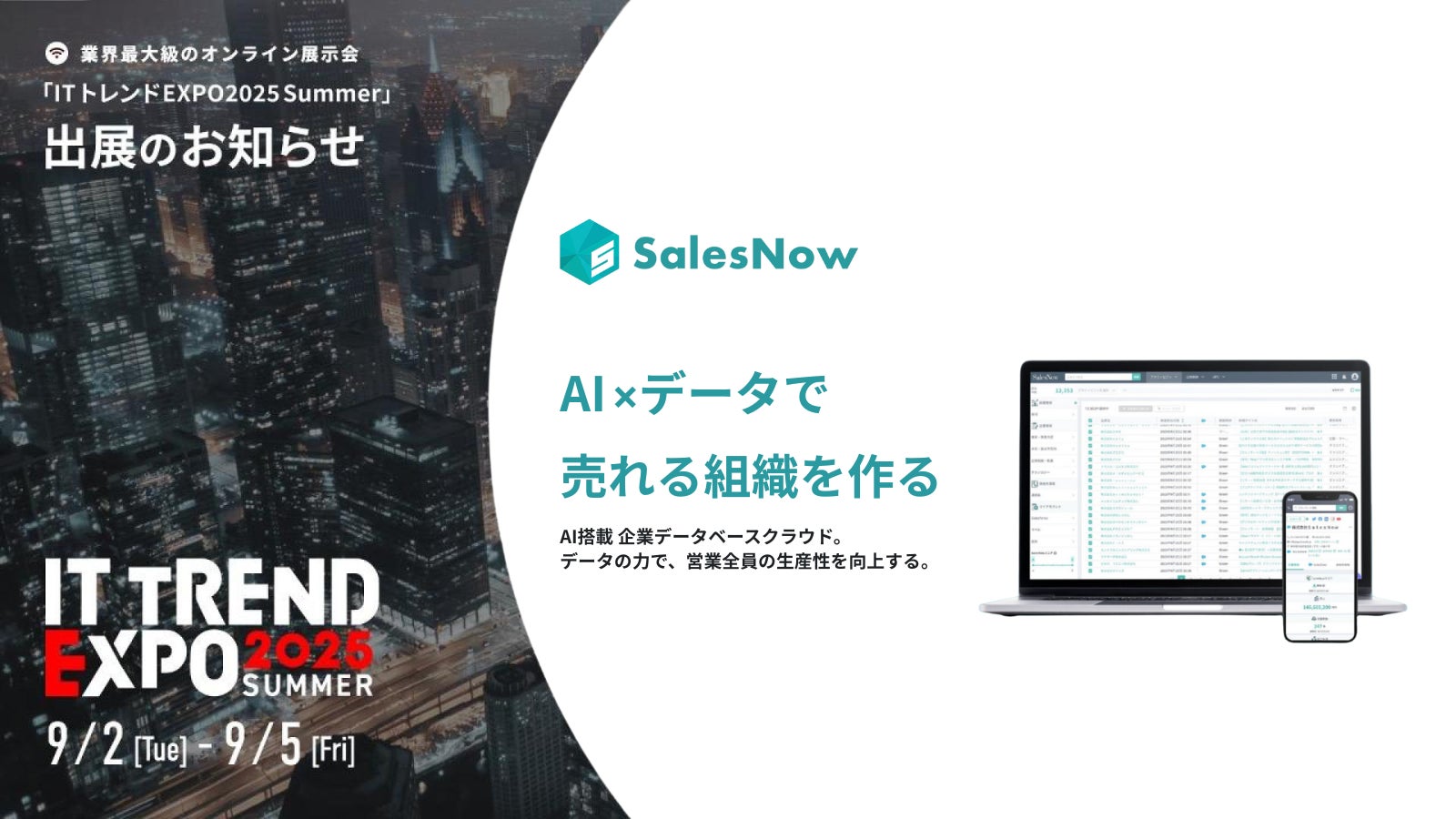 株式会社SalesNow(本社:東京都渋谷区、代表取締役:村岡功規、以下「当社」)が提供する「SalesNow」 は、株式会社イノベーション(東証グロース 証券コード3970)のグループ会社である、株式会社Innovation & Co.(本社:東京都渋谷区、代表取締役社長:幸哲史、以下「Innovation & Co.」)が主催する業界最大級のオンライン展示会「ITトレンドEXPO2025 Summer」に出展します。