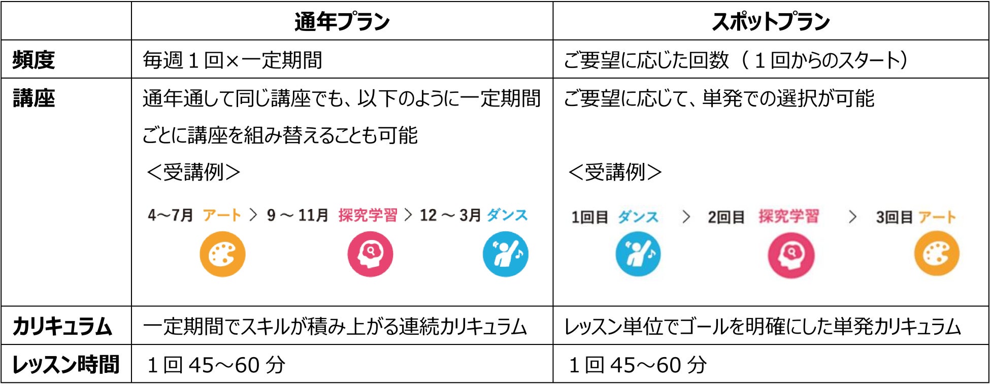 「通年プラン」は年間を通じた習い事として、「スポットプラン」は夏休みなどのイベントとしてご活用いただけます。