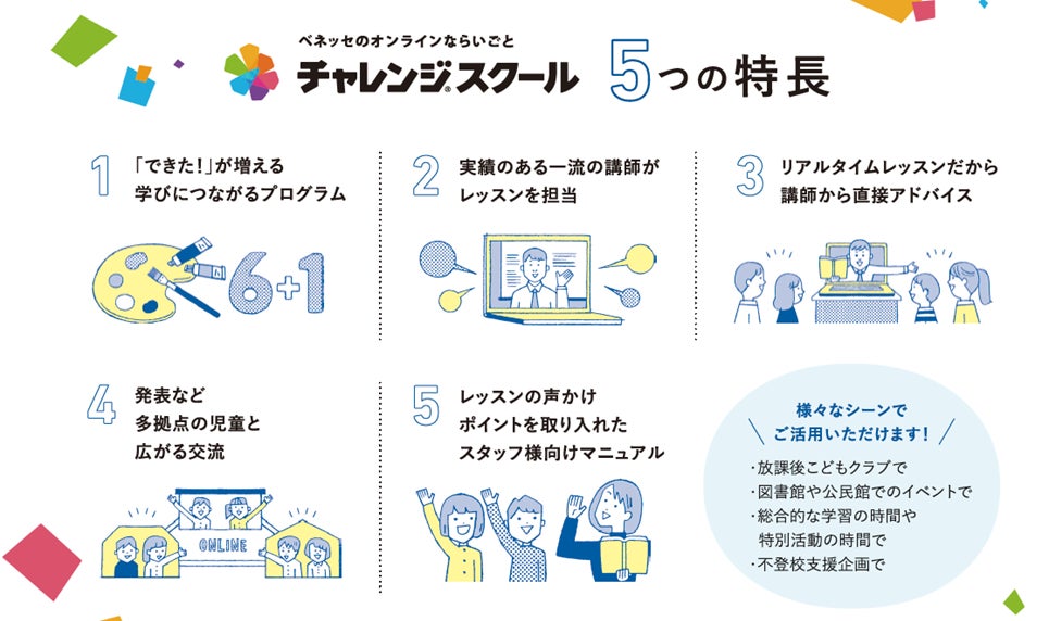 株式会社ベネッセコーポレーション(本社:岡山県岡山市、代表取締役社長:小林 仁、以下:ベネッセ)のオンラインならいごと「チャレンジスクール」では、2024年7月から全国の放課後児童クラブ(以下:学童)で「アート」「ダンス」「探究学習」の3講座の提供を開始します。提供する講座の種類は今後拡大していく予定です。公立・民間を問わず、 お申し込みいただいた全国の学童で、ご希望の期間や受講回数に応じて講座を提供します。