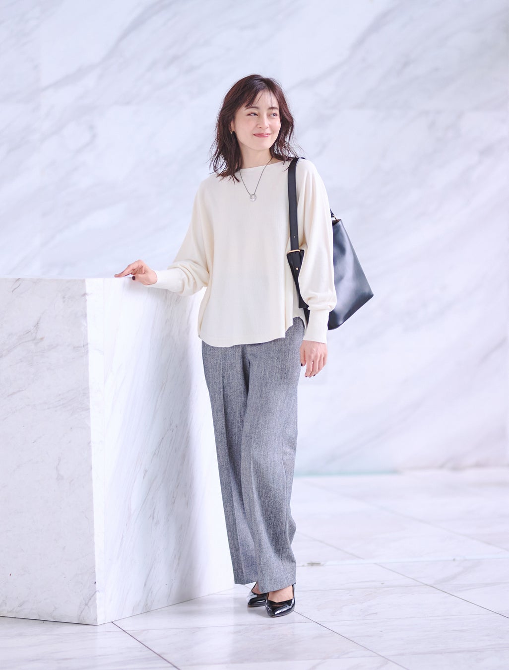 9 月20日(金)より公開する『シーン[中濱1] レスにとことん着られる!魅せる“ヘムニット”』特集の主役は、この秋アンタイトルから提案する上質感が漂うシルク混素材のニット。薄手ですっきりとした目面のしなやかな素材で、落ち感があるので、ゆったりとしたサイジングですがボリュームが出にくくすっきり着ていただけます。