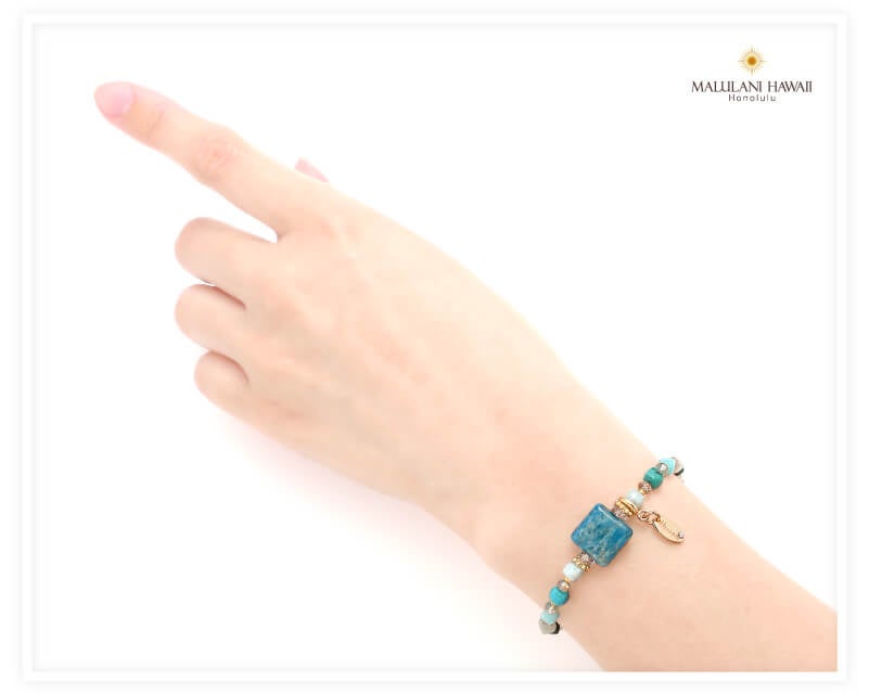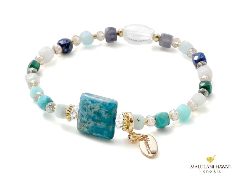地球を思わせるブルーグリーンのアパタイトを冠に、ラリマーやターコイズ、ラピスラズリなど、守護と平和をもたらす天然石を連ねたブレスレット。