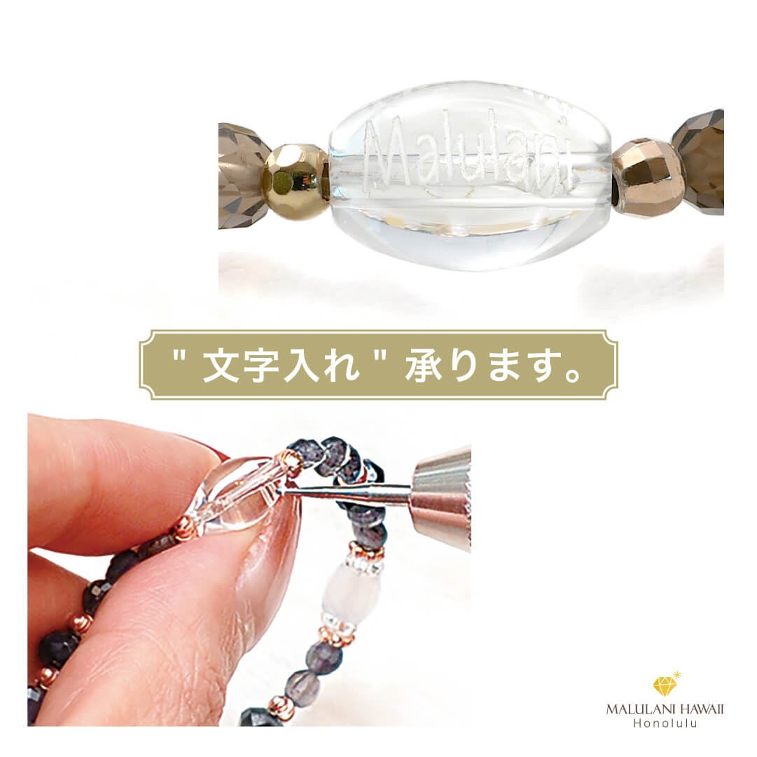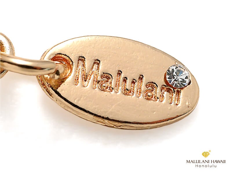オリジナルチャームと水晶には、ハワイ語で「神に護られた」という意味を持つ「Malulani」と刻印。ブランドロゴでもあるこの言葉は、持つ人に「神のご加護がありますように」との祈りをのせています。