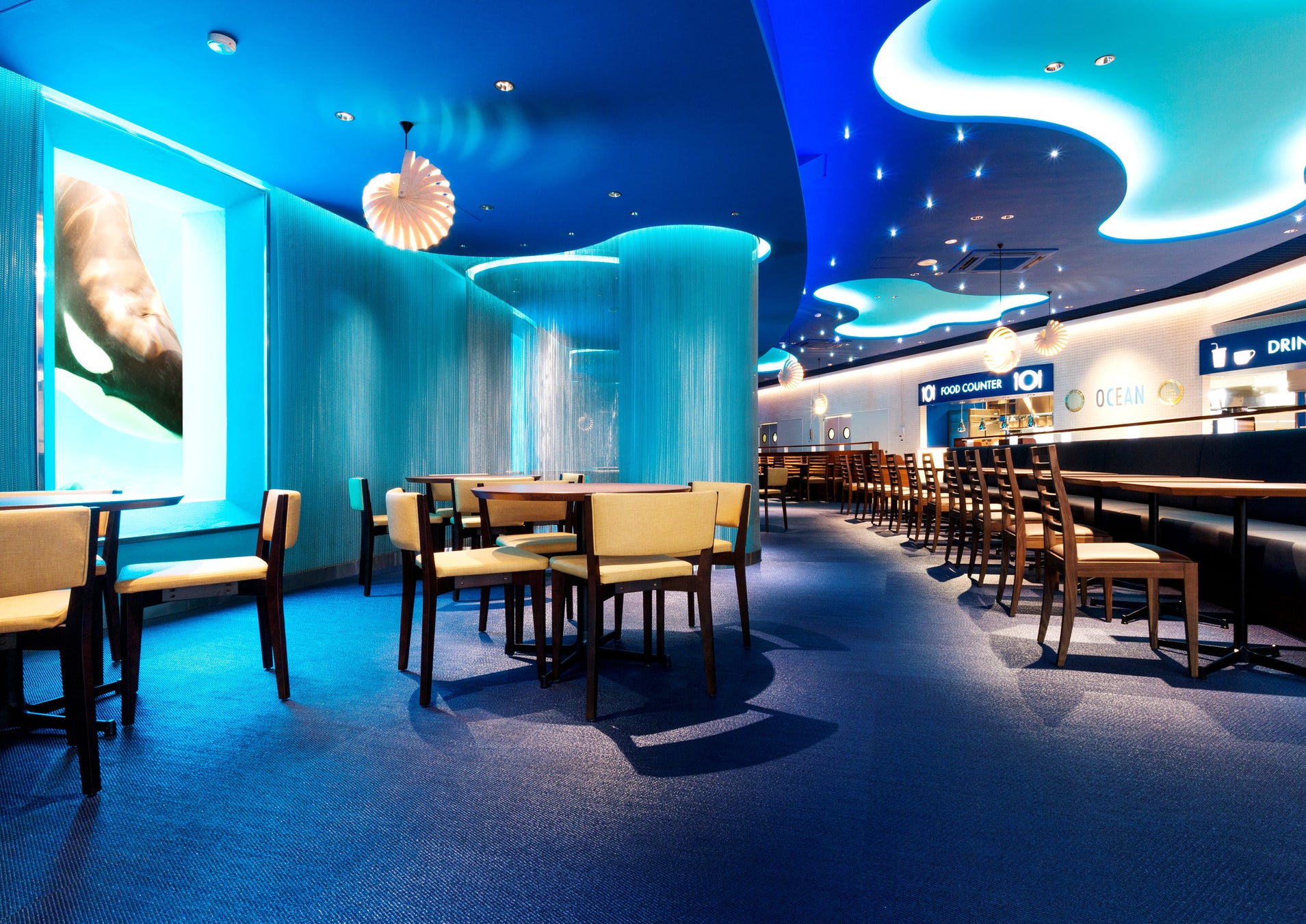 日本で唯一、シャチが水中を泳ぐ姿を見ながらお食事を楽しめるレストラン。