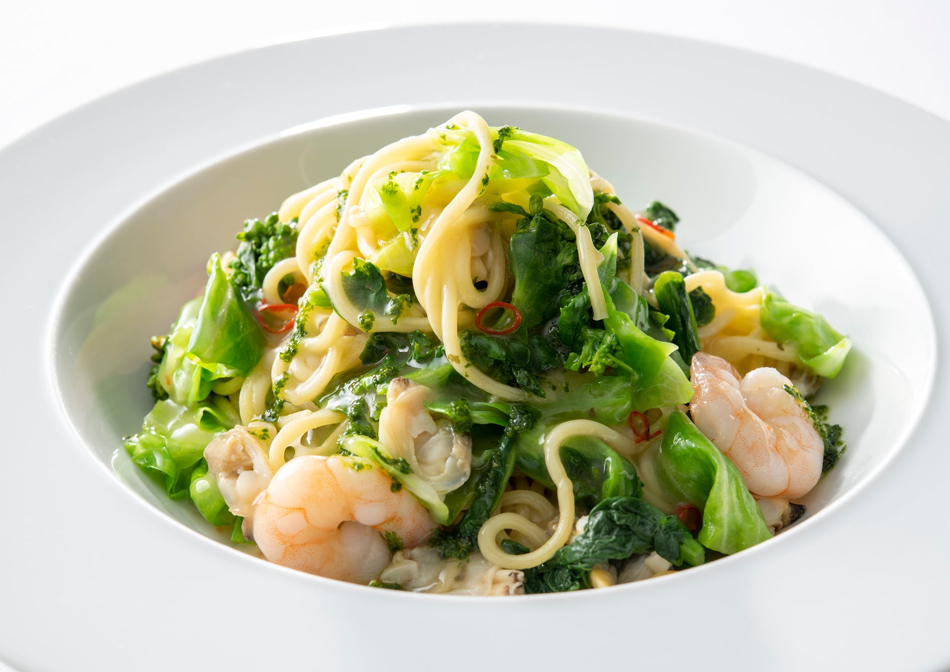 房総菜の花と春キャベツ・エビ・アサリのペペロンチーノ風パスタ 1,270円