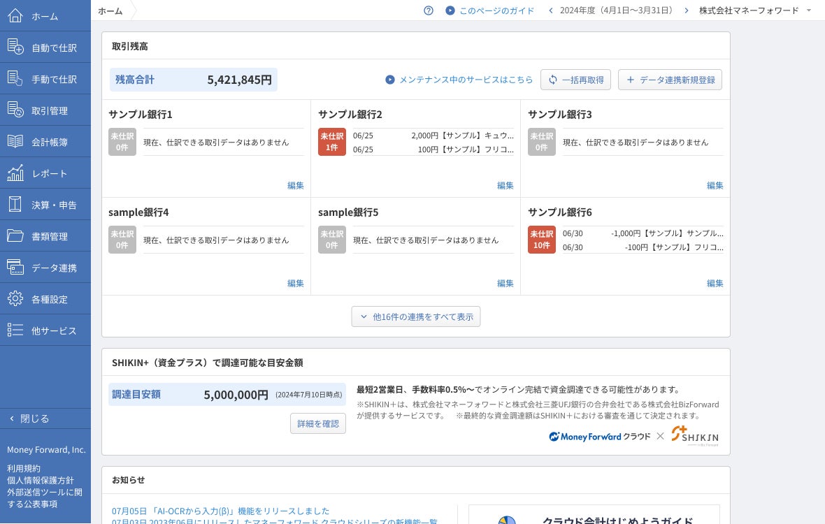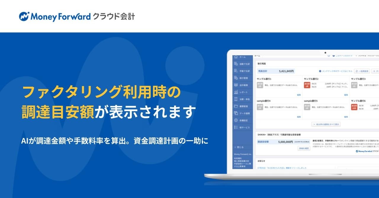 株式会社マネーフォワードは、『マネーフォワード クラウド会計』において、株式会社Biz Forwardが提供する中小企業向けオンライン型ファクタリング『SHIKIN+』を利用した場合、調達可能な目安の金額を画面に表示する機能を2024年7月より提供します。