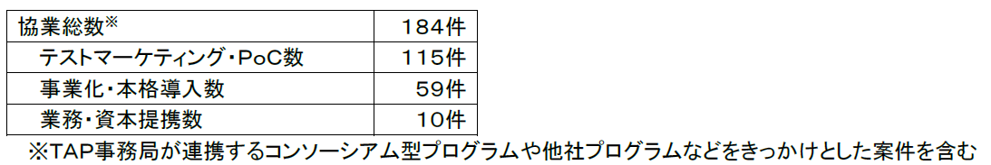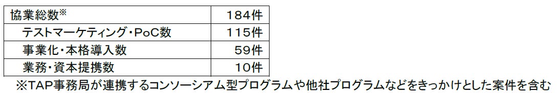 184件、うち115件のテストマーケティングやPoC、うち59件の事業化や本格導入、10件の業務・資本提携が実現しています(2026年3月19日時点)。