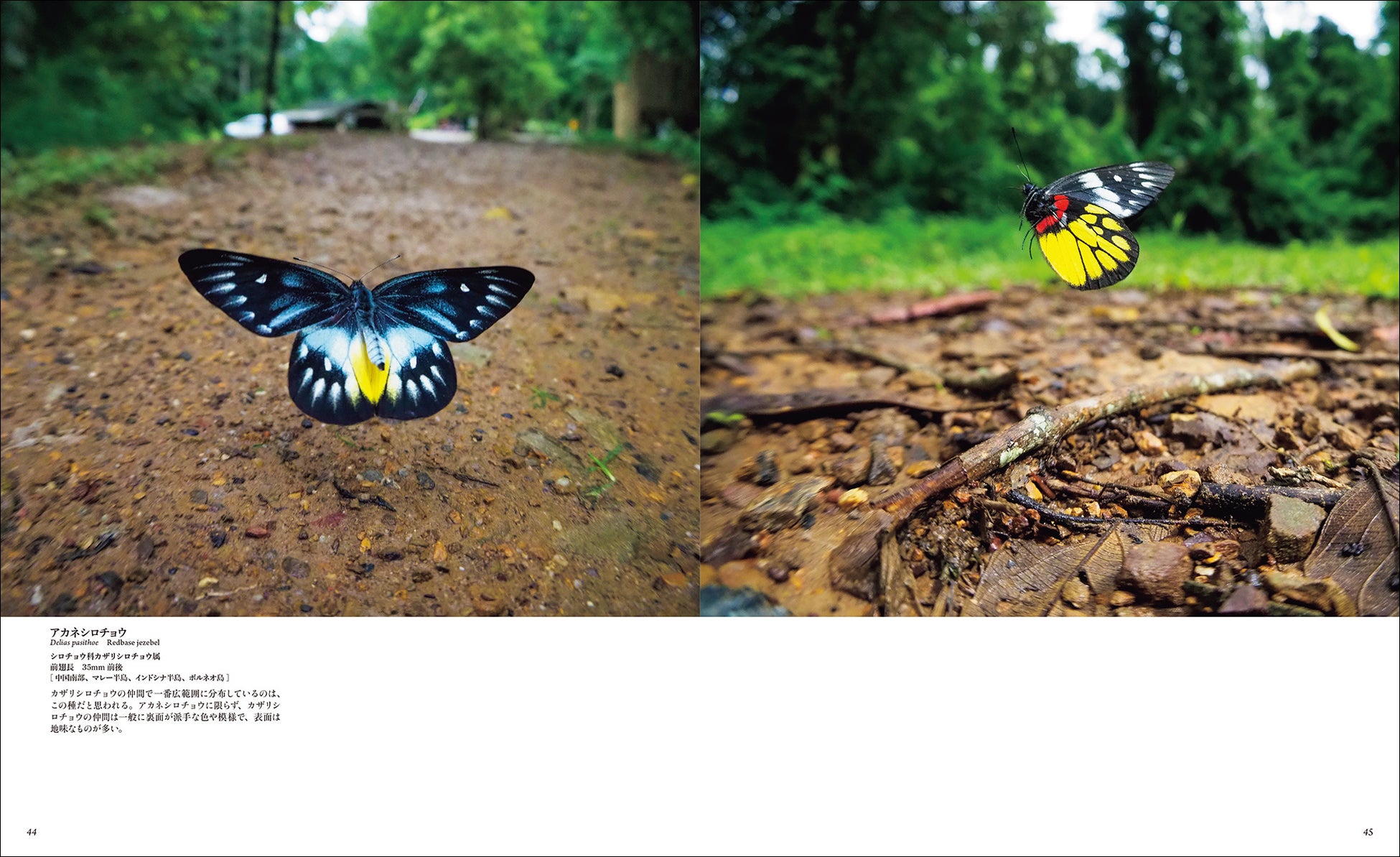 また、蝶の不思議な生態などはテキストにて解説します。ページ構成は、ダイナミックで美しい蝶の写真から始まり、蝶の行動や生態として「飛ぶ」「とまる」「表と裏」「テリトリー」「オスとメス」「集団」「ものまね」「羽化」でカテゴライズし展開します。