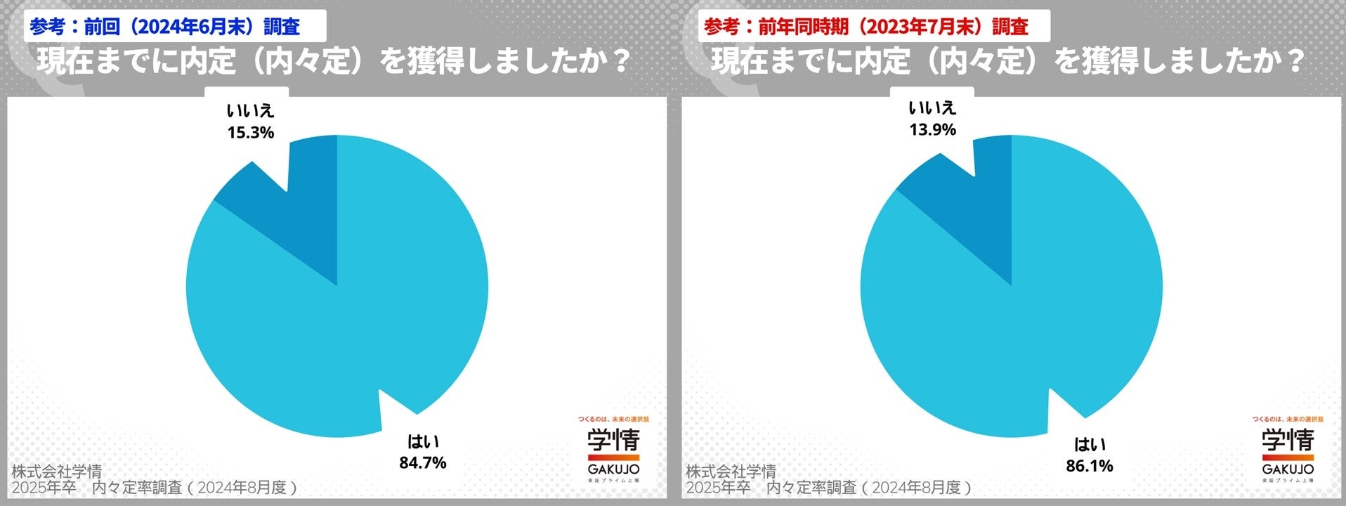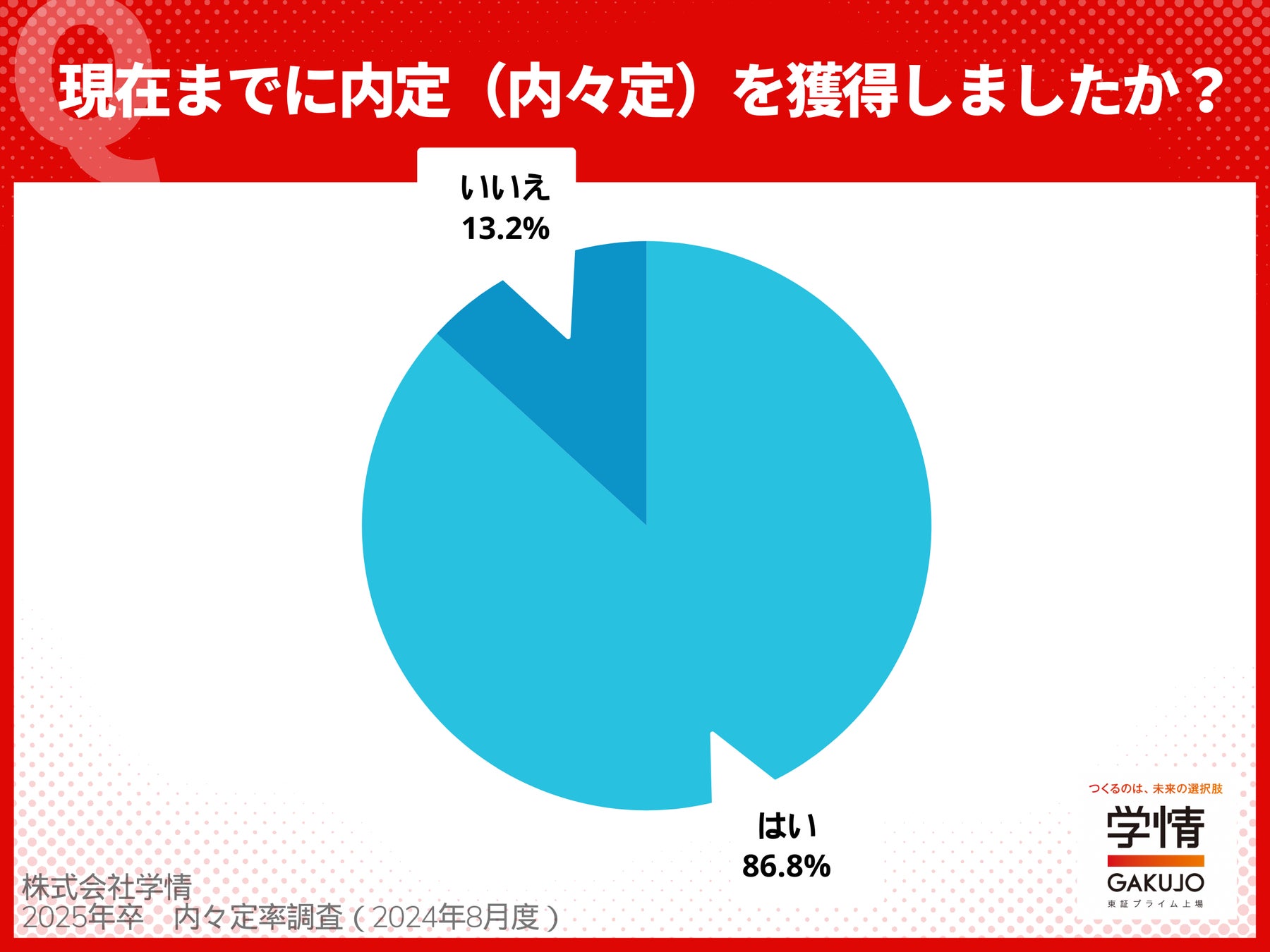 2024年7月末時点の内々定獲得率は「86.8%」でした。前月から2.1ポイントの微増となっています。