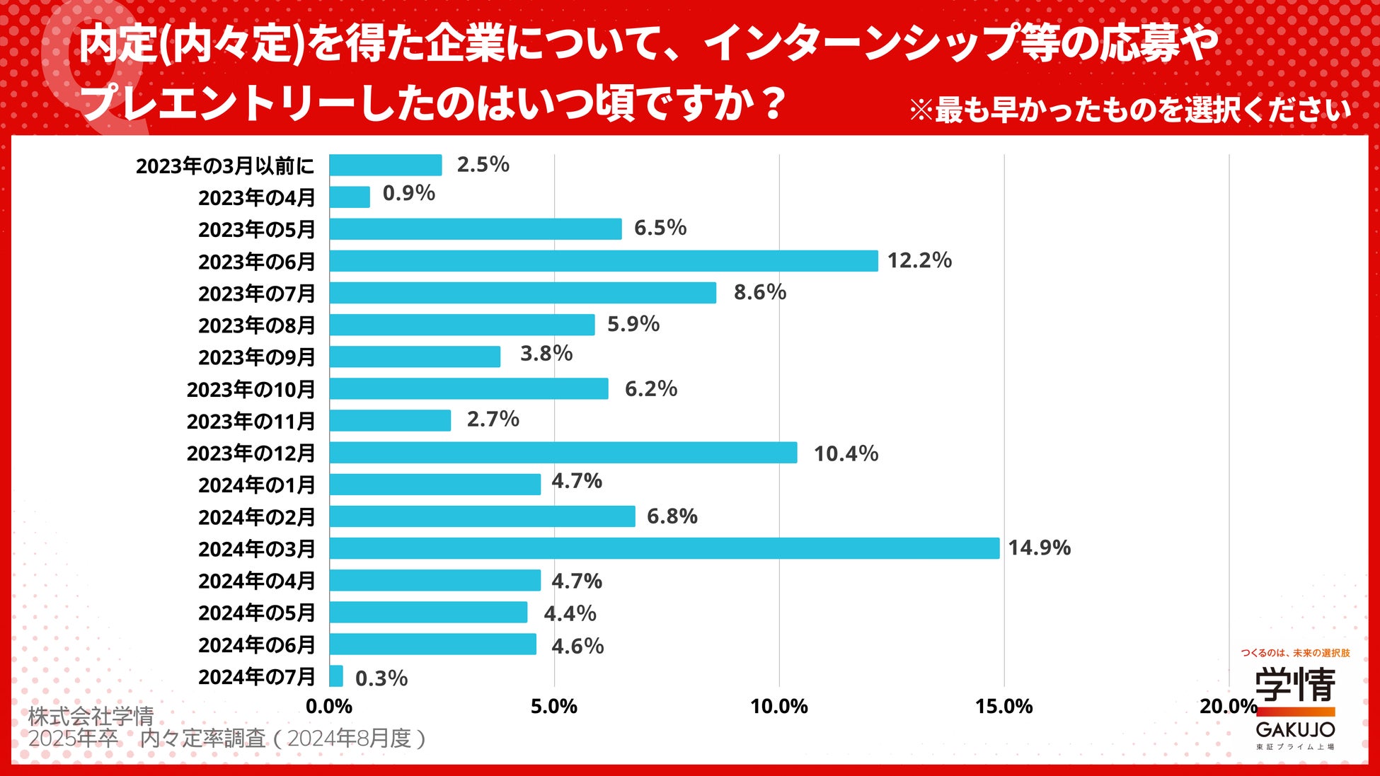 内々定を得た企業と接点をもった時期は、今年3月の「14.9%」が最多。次いで昨年6月「12.2%」、昨年12月「10.4%」と続きました。回答が10%を超えたのはこの3つの時期のみでした。