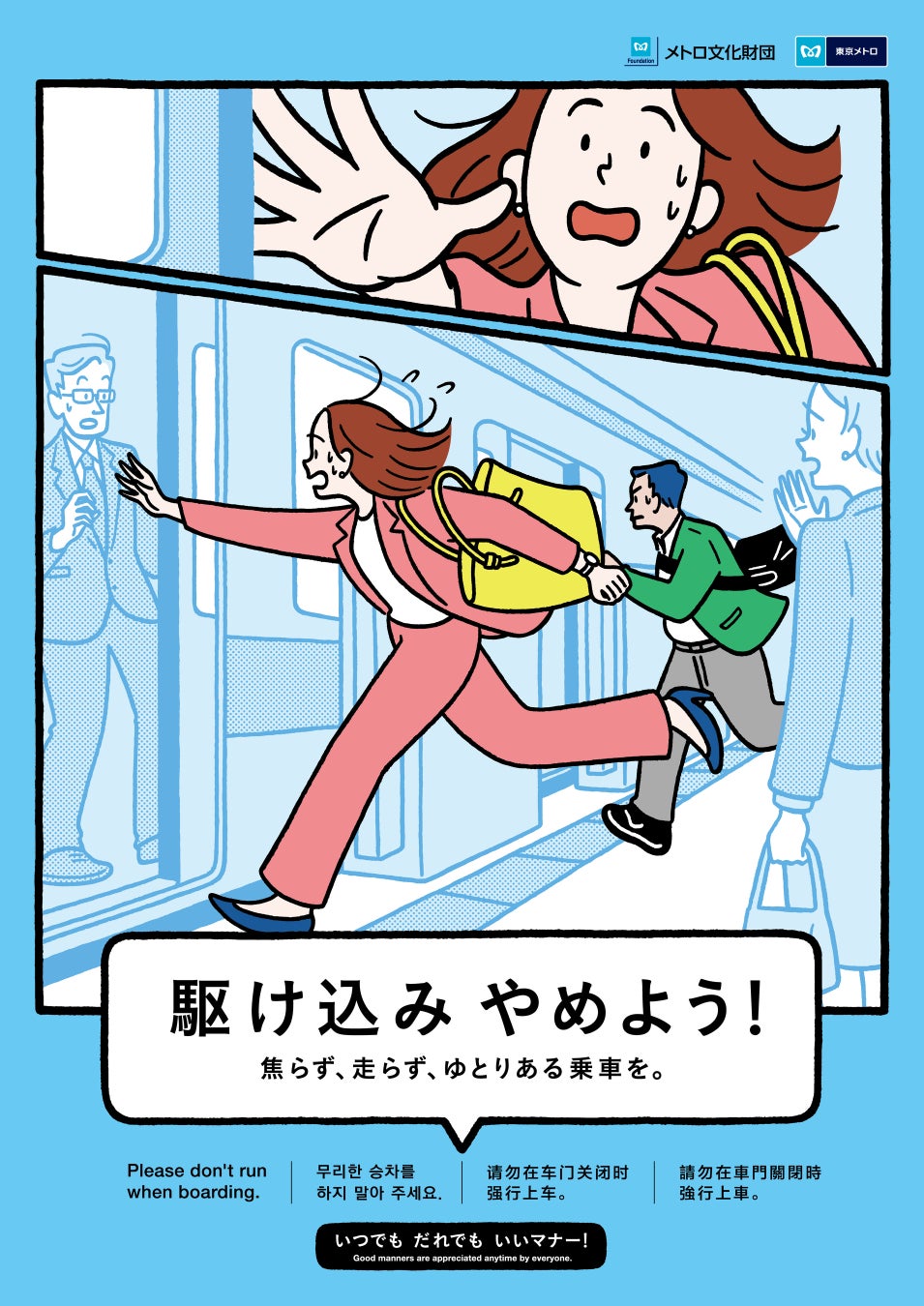 東京地下鉄株式会社(本社:東京都台東区、代表取締役社長:山村 明義)は、2025年4月から2026年3月まで、公益財団法人メトロ文化財団(東京都千代田区、会長:奥 義光)が制作するマナーポスターを駅構内及び電車内に掲出し、すべてのお客様が快適に地下鉄をご利用いただけるよう、マナー向上へのご協力を呼びかけます。