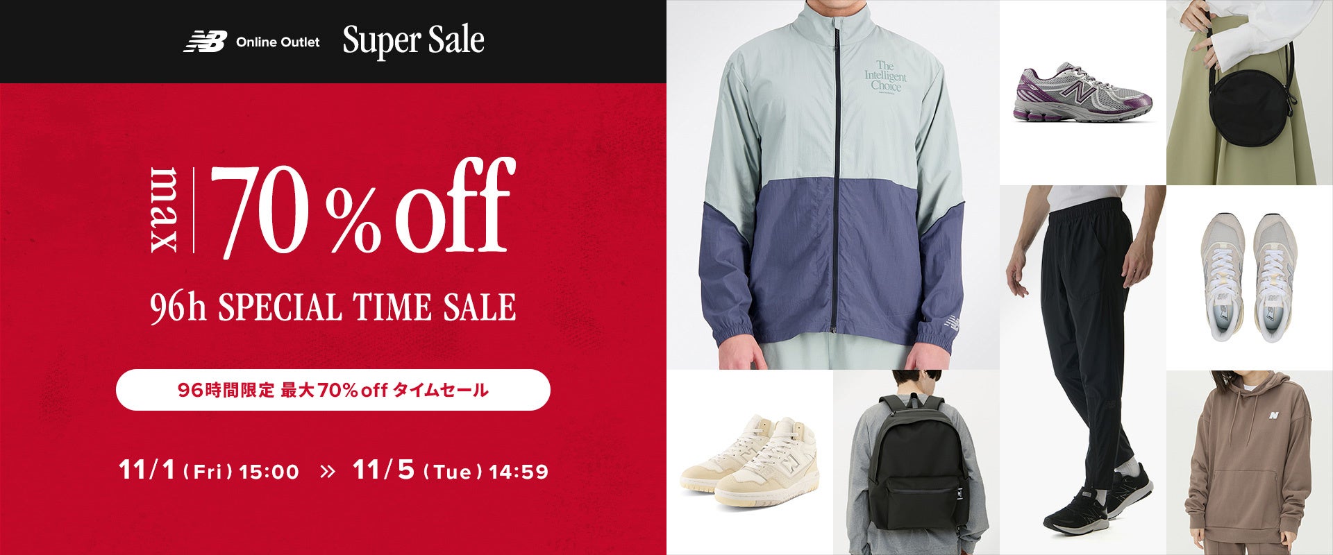「ニューバランス 公式オンラインアウトレット Super Sale」では、人気のシューズやアパレルが、さらにお得な最大70%OFFのプライスダウンとなるタイムセールを96時間限定で実施いたします。その他、期間限定のまとめ買いセールを開催し、その期間中は送料無料となります。