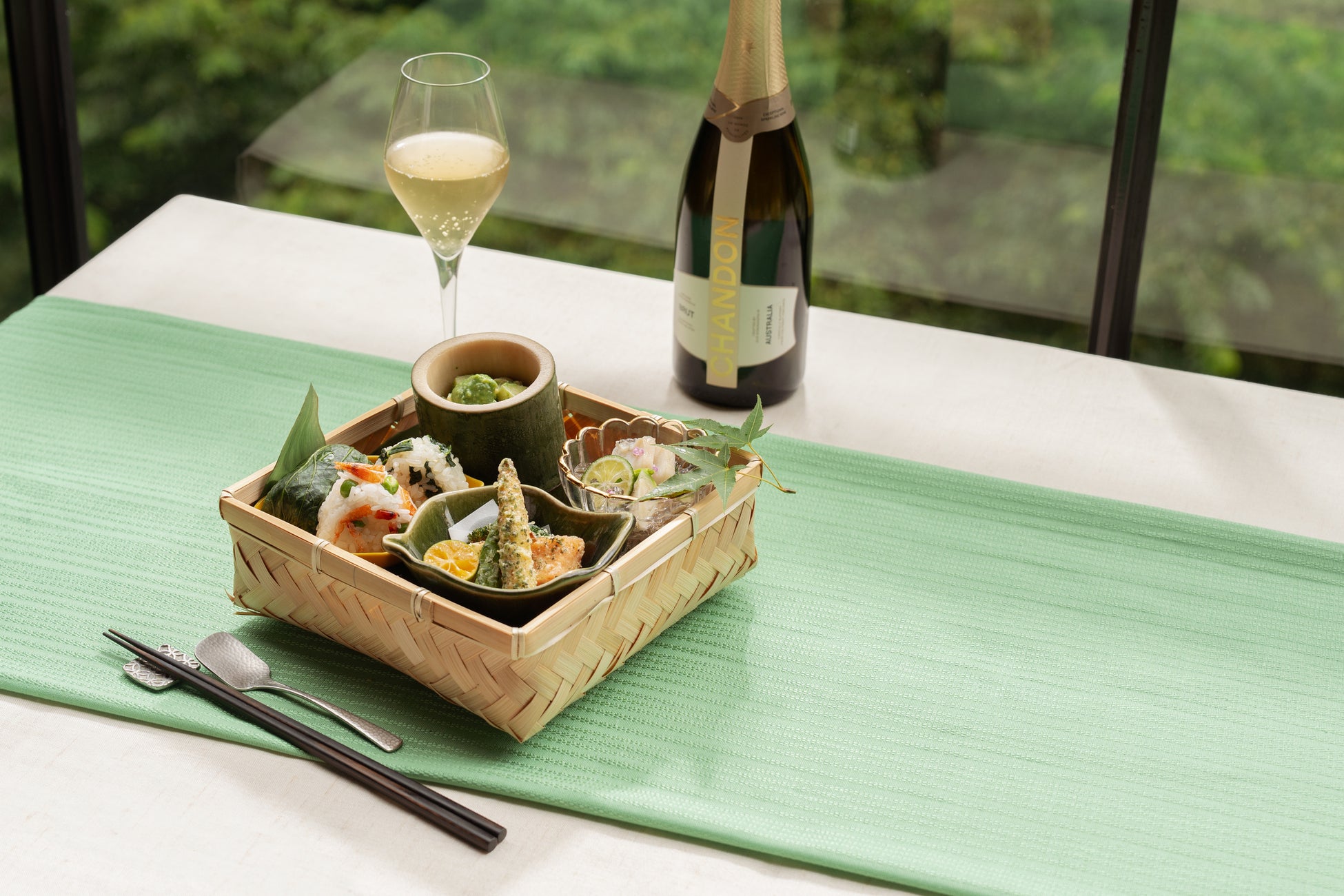 2日目の昼食は、春の柔らかな風と馬崙(マールン)山やウォーターガーデンの景色を楽しめるよう、半屋外の「風の間」で、特製の春緑弁当を味わいます。春タケノコの木の芽和えや、青菜で包んだおにぎり、山菜の天ぷらなど緑の食材がつまっています。新緑の山々に囲まれた「風の間」で春風を感じながら、春の恵みを味わう、心身を調える特別なひとときです。