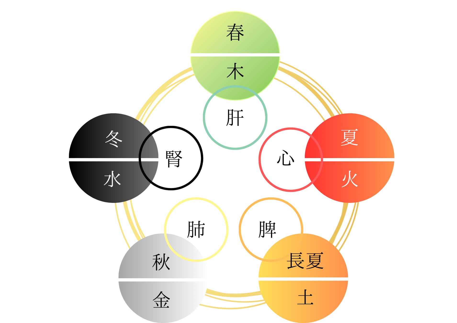 台湾では、生活の中に中医学の考えが根付いており、そのベースとなっているのが五行思想です。五行思想とは、自然界のあらゆるものを「木・火・土・金・水」の五つの要素に分類し、それらの相互影響を説明しようとするものです。「木・火・土・金・水」には、対応する季節(五時)、その季節に気を付けるべき臓器(五臓)や、積極的に摂取することで体の働きを助ける色(五色)がそれぞれ決まっています(*1)。