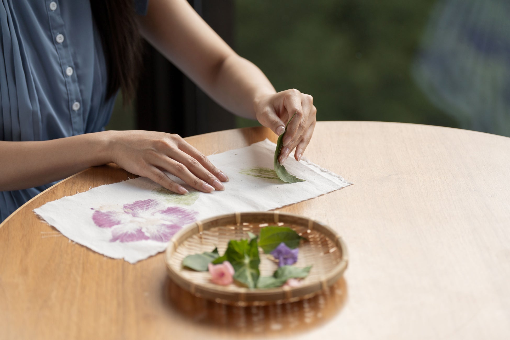 2日目には、ウォーターガーデンでの「草摘みとハーブボール作り」を行います。まず、植物の命を支える葉脈に注目しながら、好みの葉脈を持つ草を摘みます。葉脈の様子をじっくりと観察することで、自然の造形の美しさを感じます。そして、摘み取った草の葉脈を、「葉脈拓本(たくほん)」という技法で、布袋に写しとります。一連の作業に集中することで脳をリフレッシュさせます。