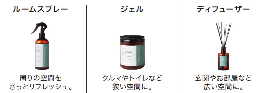 消臭効果と心地よい香りを同時に楽しめます。ラインアップはルームスプレー・ジェル・ディフューザーの3種類で、用途や設置場所に合わせてお選びいただけます。