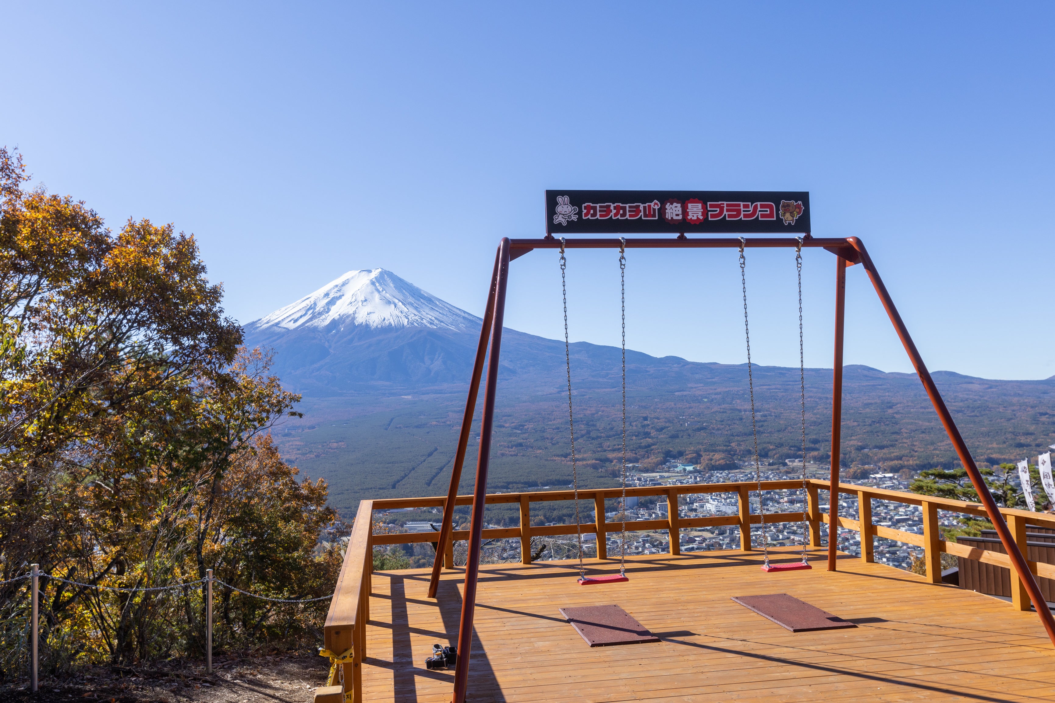 さらに、展望広場の中でも一段高い場所に位置するのが「カチカチ山絶景ブランコ」です。眼前にそびえる富士山に向かって高さ約3.5 メートルの大きなブランコを漕ぎ出せば、大パノラマに飛び込むかのような爽快体験を味わえます。