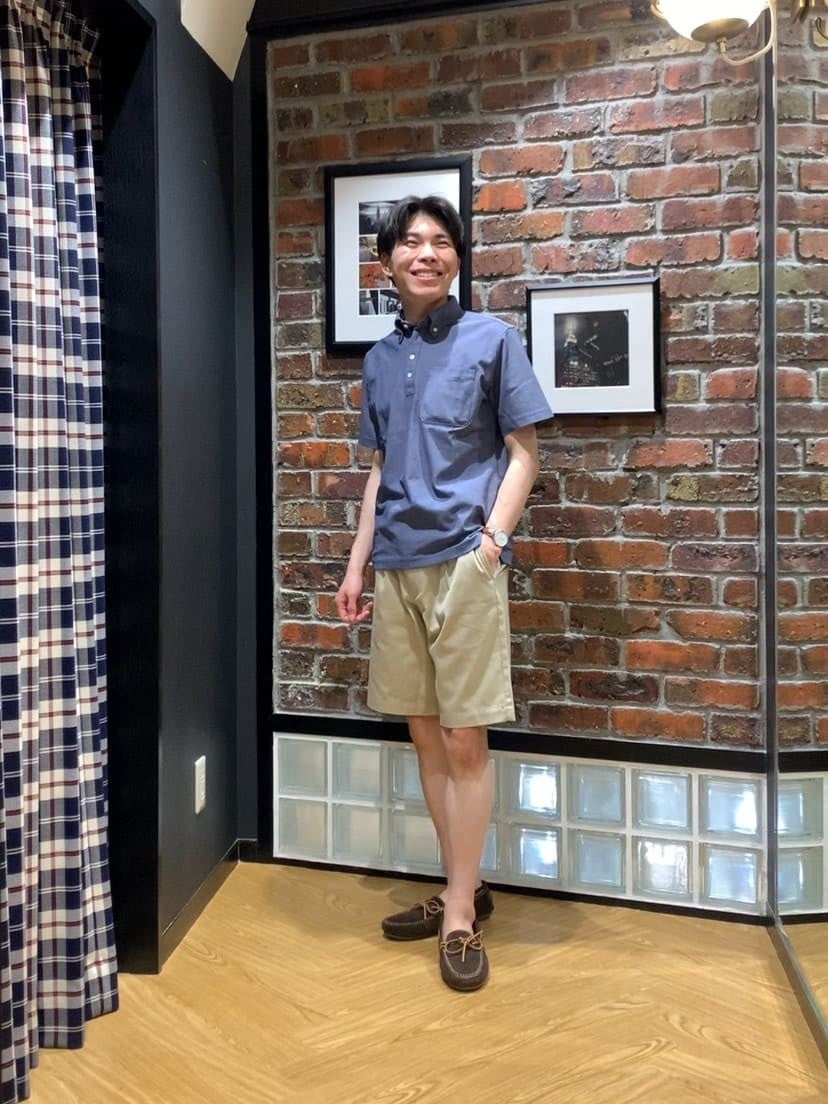 砂浜を連想させるブルー×ベージュが夏らしい配色のサマートラッドスタイル。ラフになりがちなハーフパンツも、足元をローファーにすることで品を忘れないスタイリングに。ポロシャツの裾は、ボトムにインしてもアウトにしても、どちらでもカッコよく決まります!