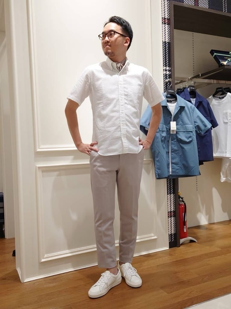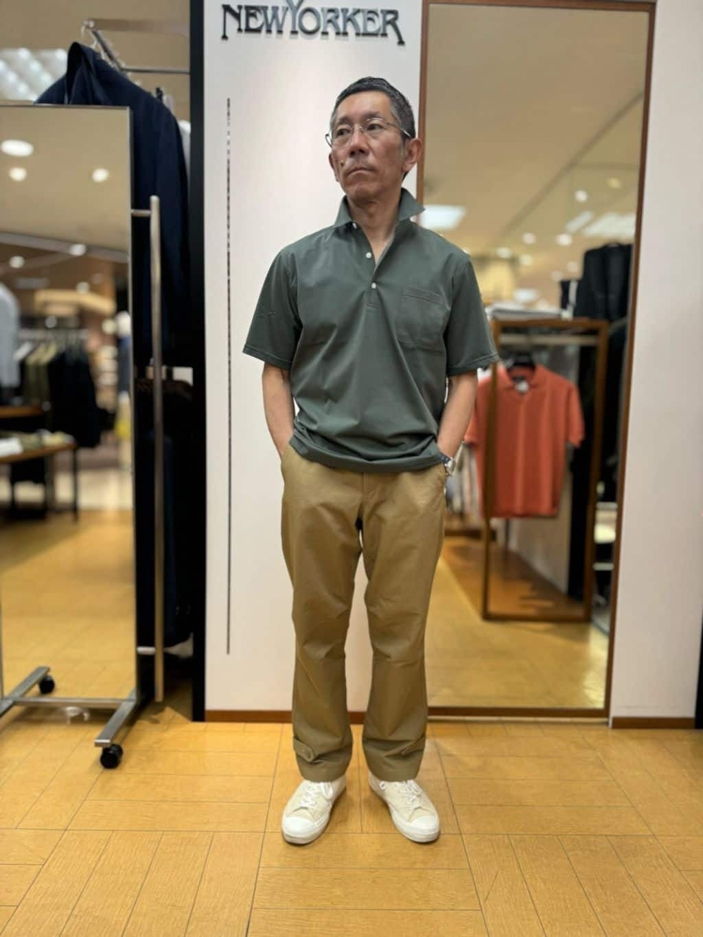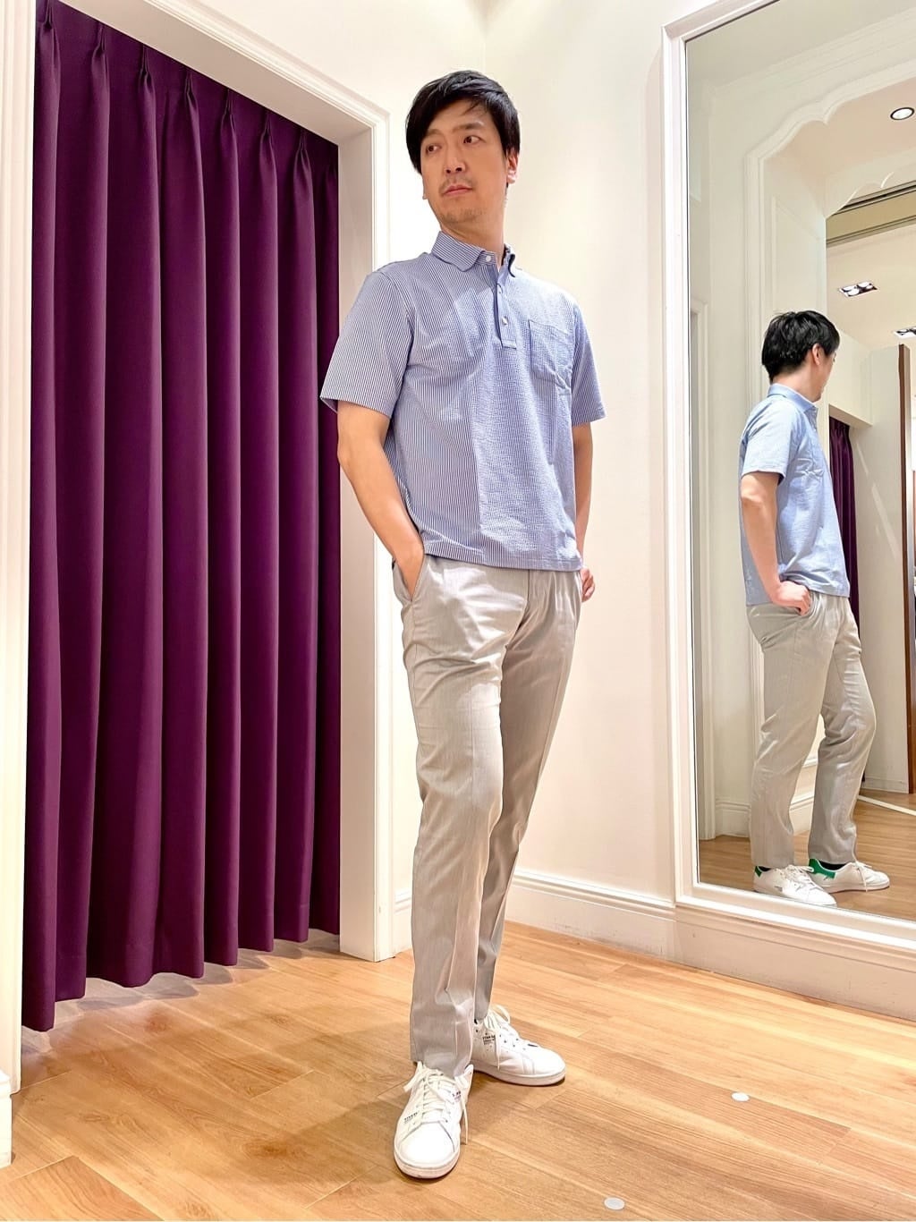 軽やかさと清涼感のあるポロシャツに、カジュアルなパンツとスニーカーを合わせた、早起きしてアクティブに動きたくなるスポーティースタイル。快適な着心地ながらも、ポロシャツの襟と清涼カラーできちんと感が演出される一石二鳥なスタイリングです。