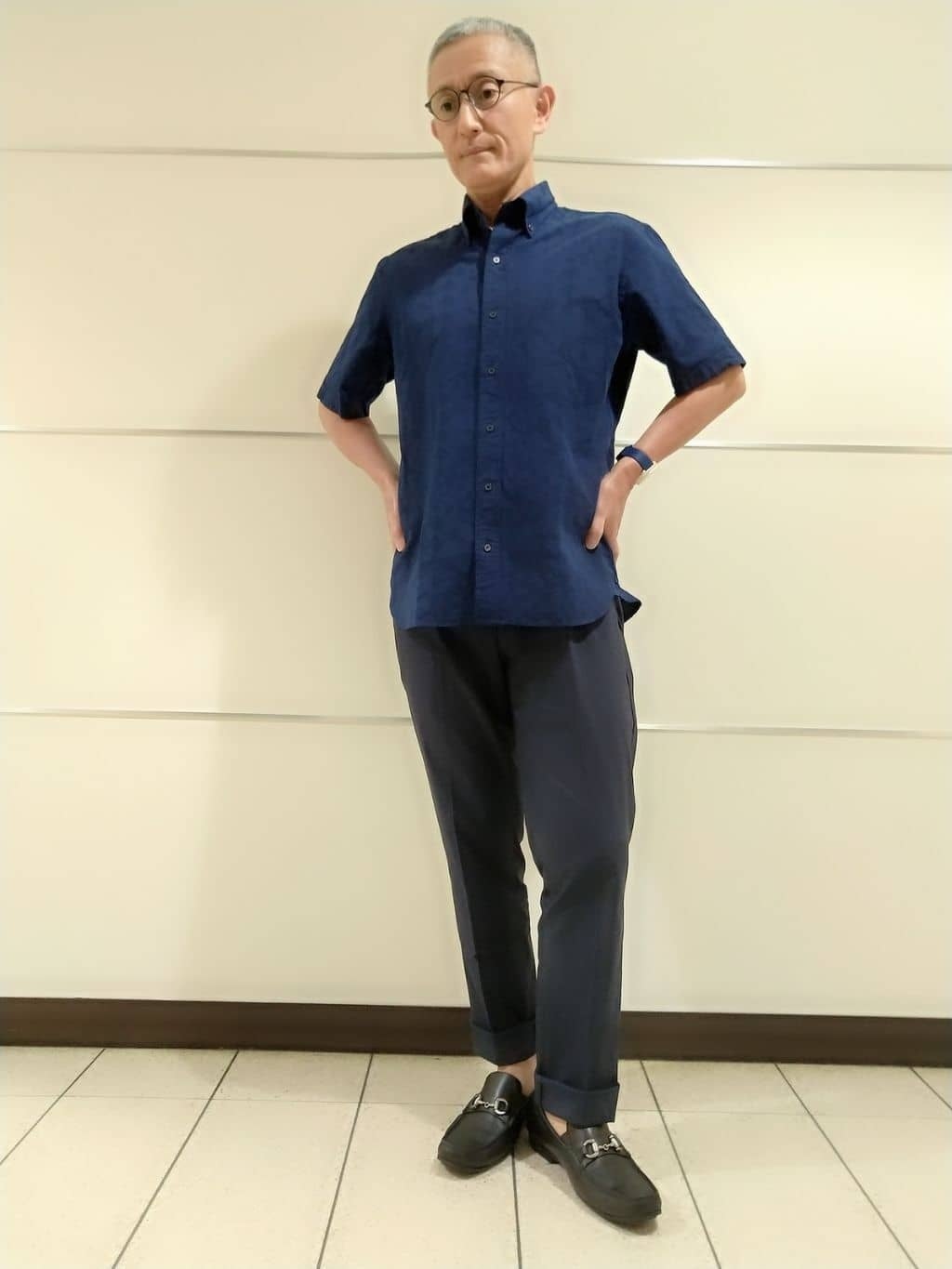 休日スタイルをイメージしたコーデですが、思いきってネイビー1色コーデに挑戦!初夏にダークトーン、引き締まって見えるのでおすすめです。靴を白のキャンバススニーカーにしても清涼感が増します。
