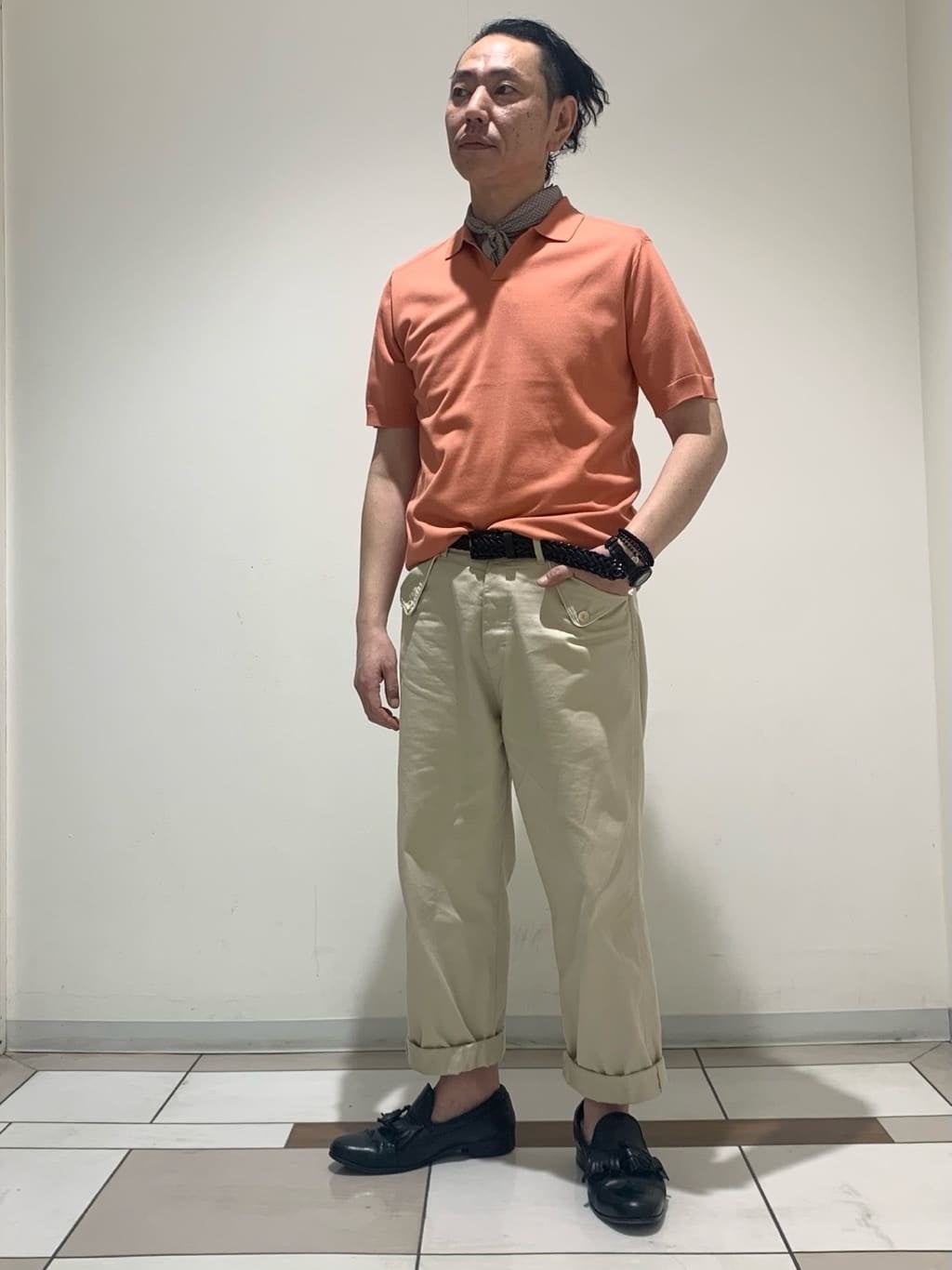 ポロシャツのオレンジが夏の陽射しに映える、暖色系でまとめた大人の休日コーデ。スキッパー襟で開いた首元にはオレンジのネッカチーフで洒落感をプラス。ブラウンのベルトや靴を合わせれば、統一感を出しつつ、メリハリのあるコーディネートの完成です。