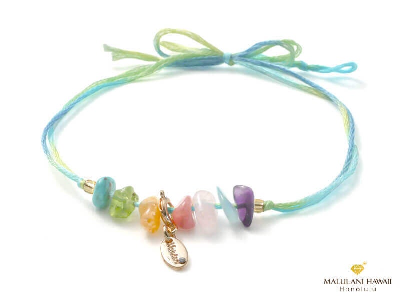 アメジスト、アクアマリン、ローズクォーツ、インカローズ、シトリン、ペリドット、ターコイズの、7つの石で仕立てたミサンガは、心が明るくなる華やかな優しさが魅力です。