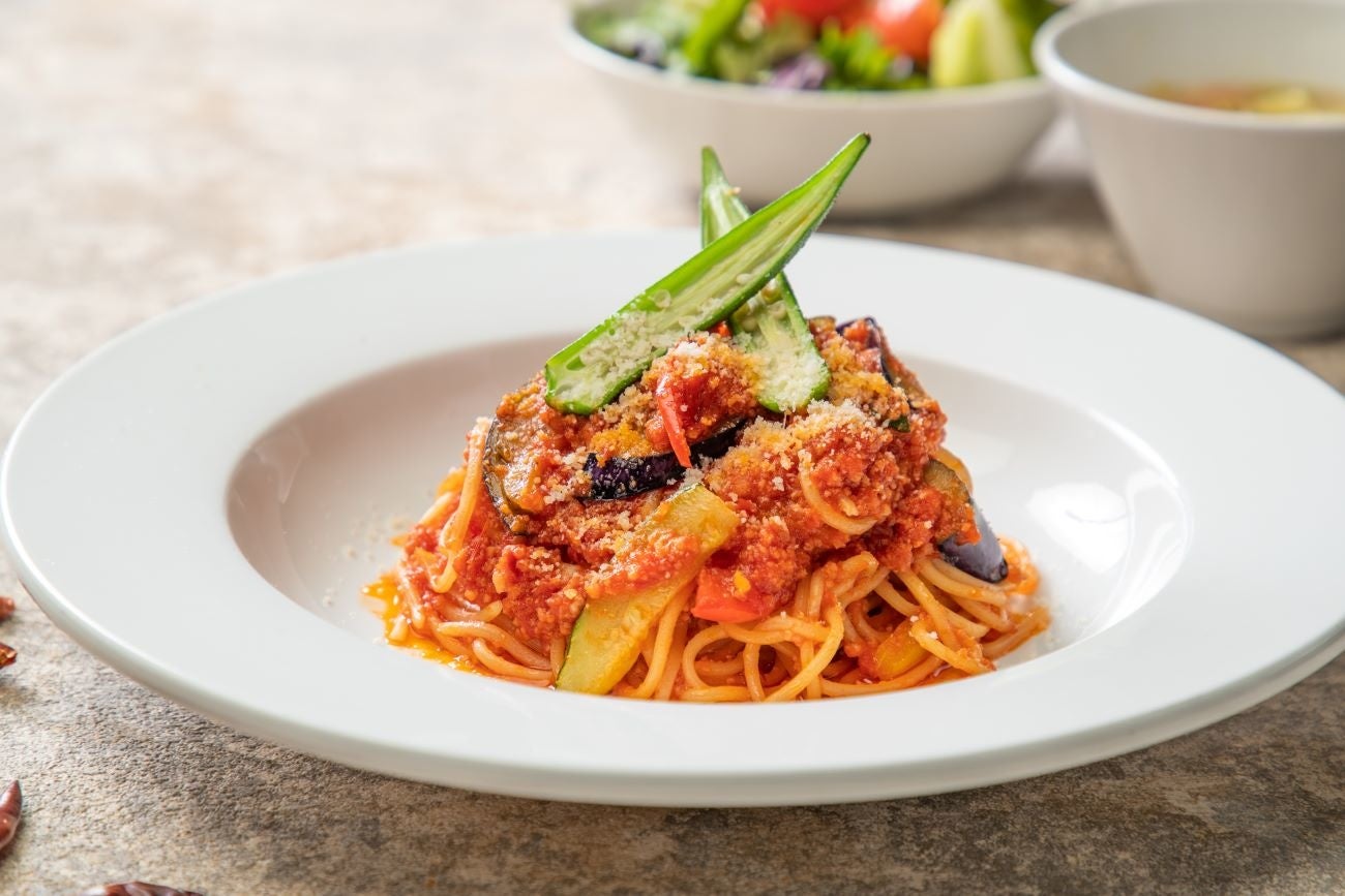 6月限定メニューの他にお勧めしたいのが「夏野菜のアラビアータ」。にんにくの風味と唐辛子の辛みをきかせた真っ赤なトマトソースに夏野菜の旨味と栄養をプラスした、食欲をかき立てるピリっと辛い、「怒りんぼパスタ」。