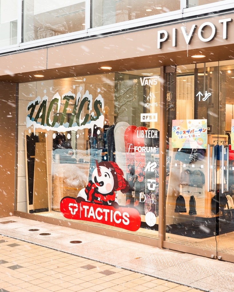 今回のPOP UPでは、「TACTICS SAPPORO」がセレクトするアイテムを通して、ブランドの世界観や魅力をより多くのお客様に体感いただくことを目的に、札幌ではここでしか出会えない、スノーボードを軸にしたグローバルな視点とカルチャーを街の中心で体感していただきます。
