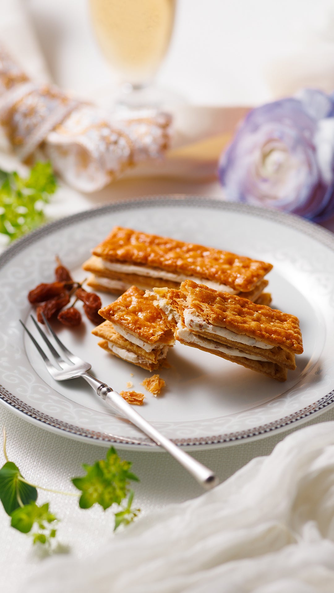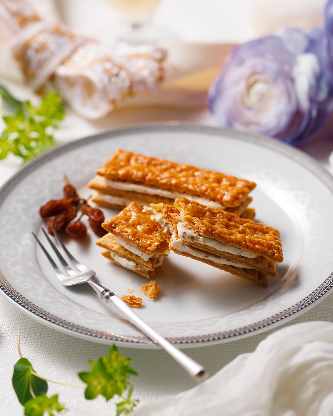 フランス産の小麦パイ生地を使用した、“サクッ”とした食感が特徴のこだわりのフィユタージュに、ラム酒香るレーズン入りのクリームをサンドしました。甘さをひかえめにし、上品な味わいに仕上げました。